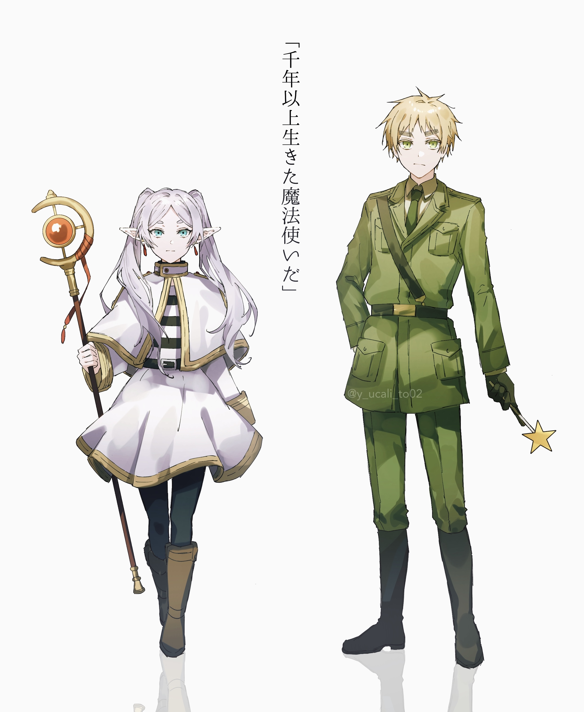 1boy 1girl absurdres aqua_eyes axis_powers_hetalia belt belt_buckle blonde_hair boots breast_pocket buckle capelet crossover earrings elf expressionless floating_earrings frieren full_body green_eyes hand_on_own_hip highres holding holding_wand jewelry long_hair mage_staff necktie pocket pointy_ears sam_browne_belt shirt simple_background sousou_no_frieren staff star_wand straight-on striped_clothes striped_shirt thick_eyebrows trait_connection translation_request twintails united_kingdom_(hetalia) wand white_background white_capelet white_hair wizard yu_kari_to