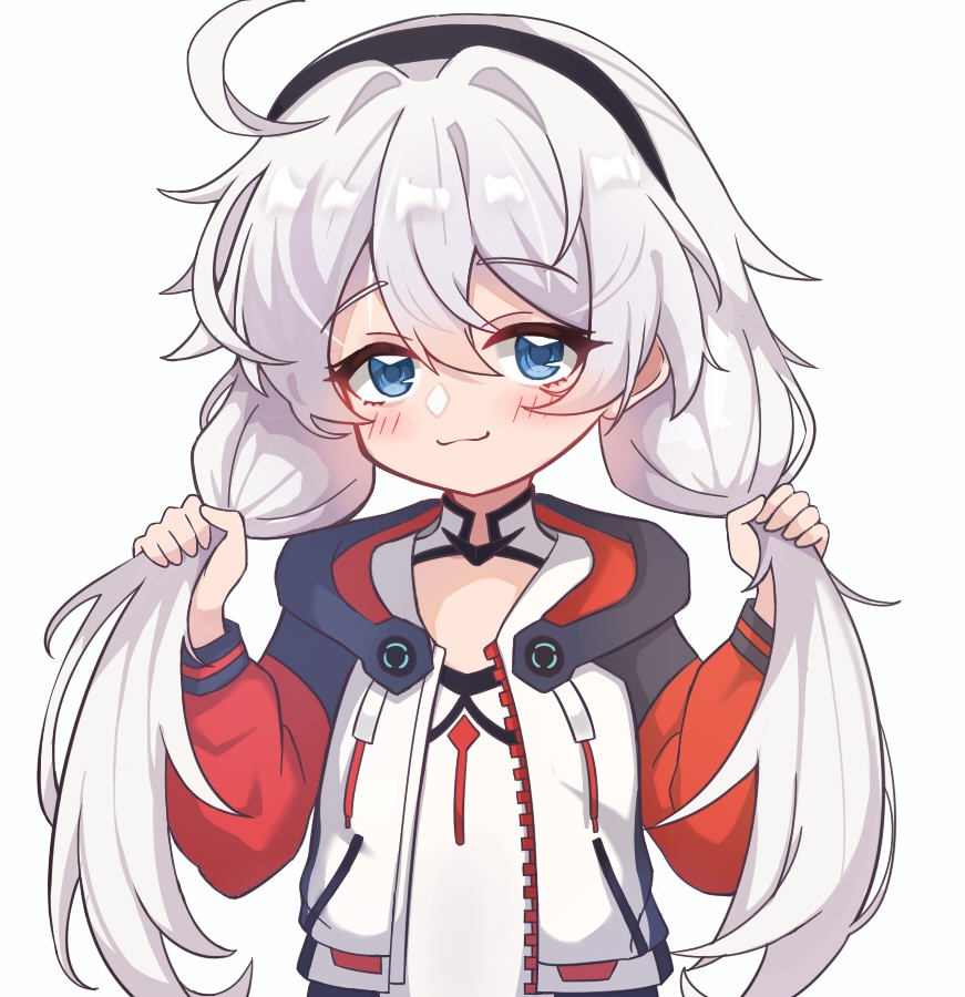 1girl :3 ahoge black_hairband blue_eyes blush bunching_hair chinese_commentary commentary gululu_w hair_between_eyes hair_intakes hairband honkai_(series) honkai_impact_3rd hood hood_down hooded_jacket jacket kiana_kaslana kiana_kaslana_(prodigal_girl) kiana_kaslana_(white_comet) long_hair looking_at_viewer open_clothes open_jacket shirt simple_background solo twintails upper_body white_background white_hair white_jacket white_shirt zipper