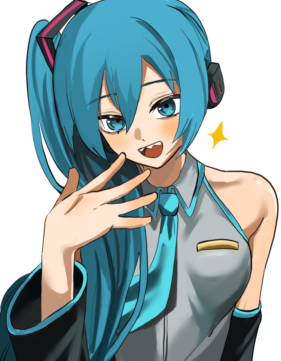 1girl aqua_necktie black_sleeves blush broken_miku's_tail_(meme) collared_shirt commentary english_commentary hair_between_eyes hand_up hatsune_miku hatsune_miku_(noodle_stopper) headphones highres long_hair long_sleeves looking_at_viewer meme mykokampfwagen necktie open_mouth shirt side_ponytail simple_background single_bare_shoulder sleeveless sleeveless_shirt smile solo sparkle upper_body very_long_hair vocaloid white_background