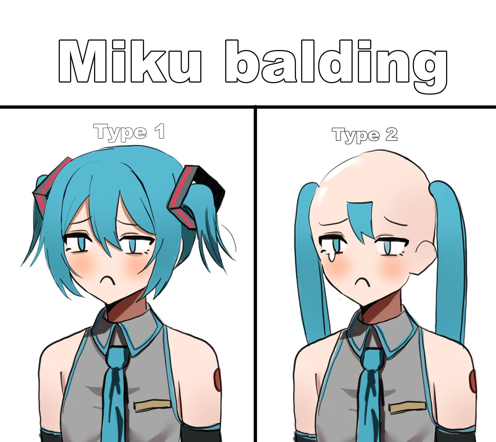 1girl alternate_hair_length alternate_hairstyle aqua_eyes aqua_hair aqua_necktie bald bald_female blush closed_mouth collared_shirt commentary english_commentary english_text frown grey_shirt hair_ornament hatsune_miku highres long_hair mykokampfwagen necktie shirt short_hair sidelocks sleeveless sleeveless_shirt twintails upper_body vocaloid