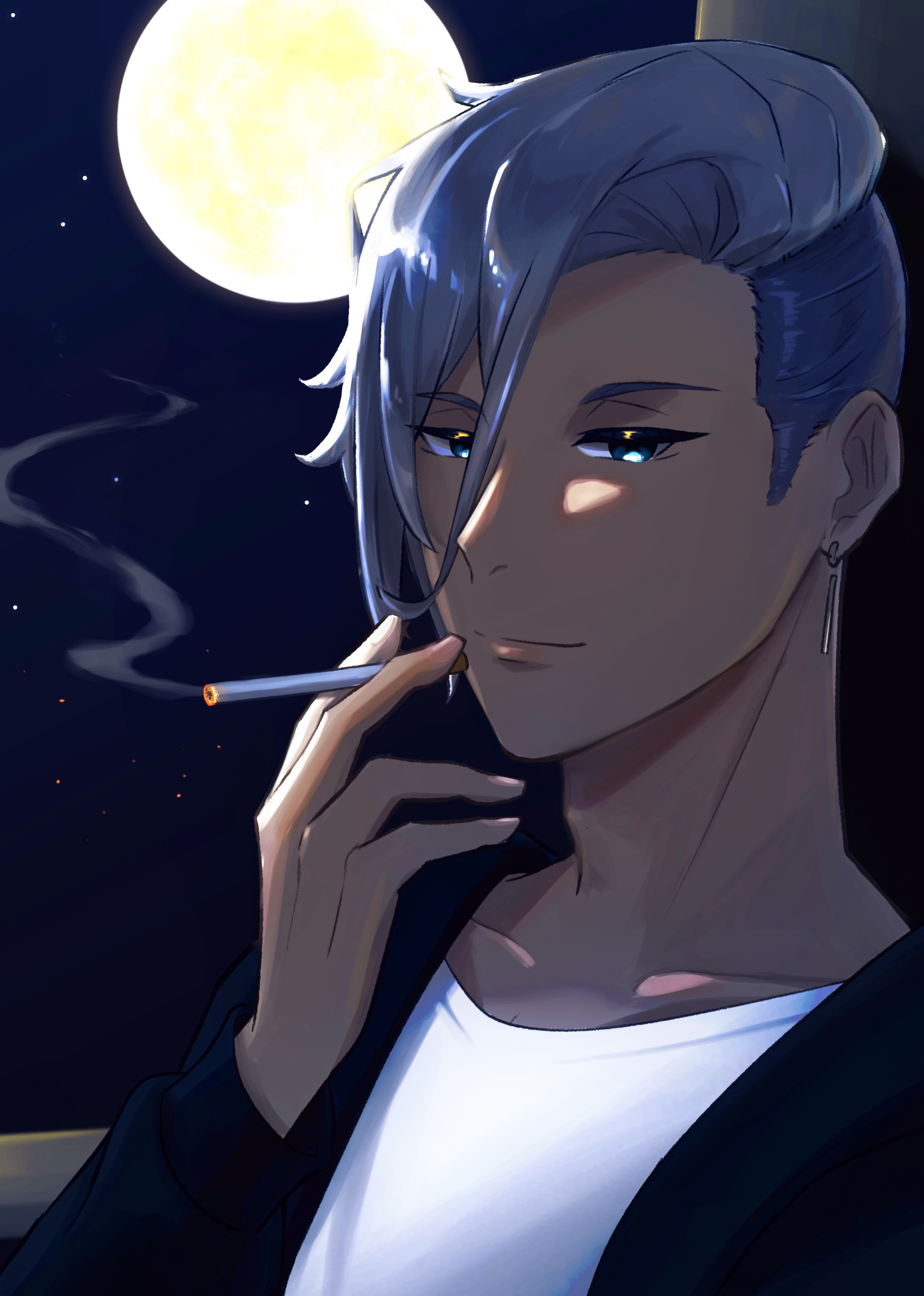 1boy absurdres bishounen blue_eyes cigarette contemporary earrings full_body grey_hair hair_between_eyes hand_up highres holding holding_cigarette jewelry looking_at_viewer male_focus moon nakukaba night revenger shirt sky smoking solo usui_yuen white_shirt