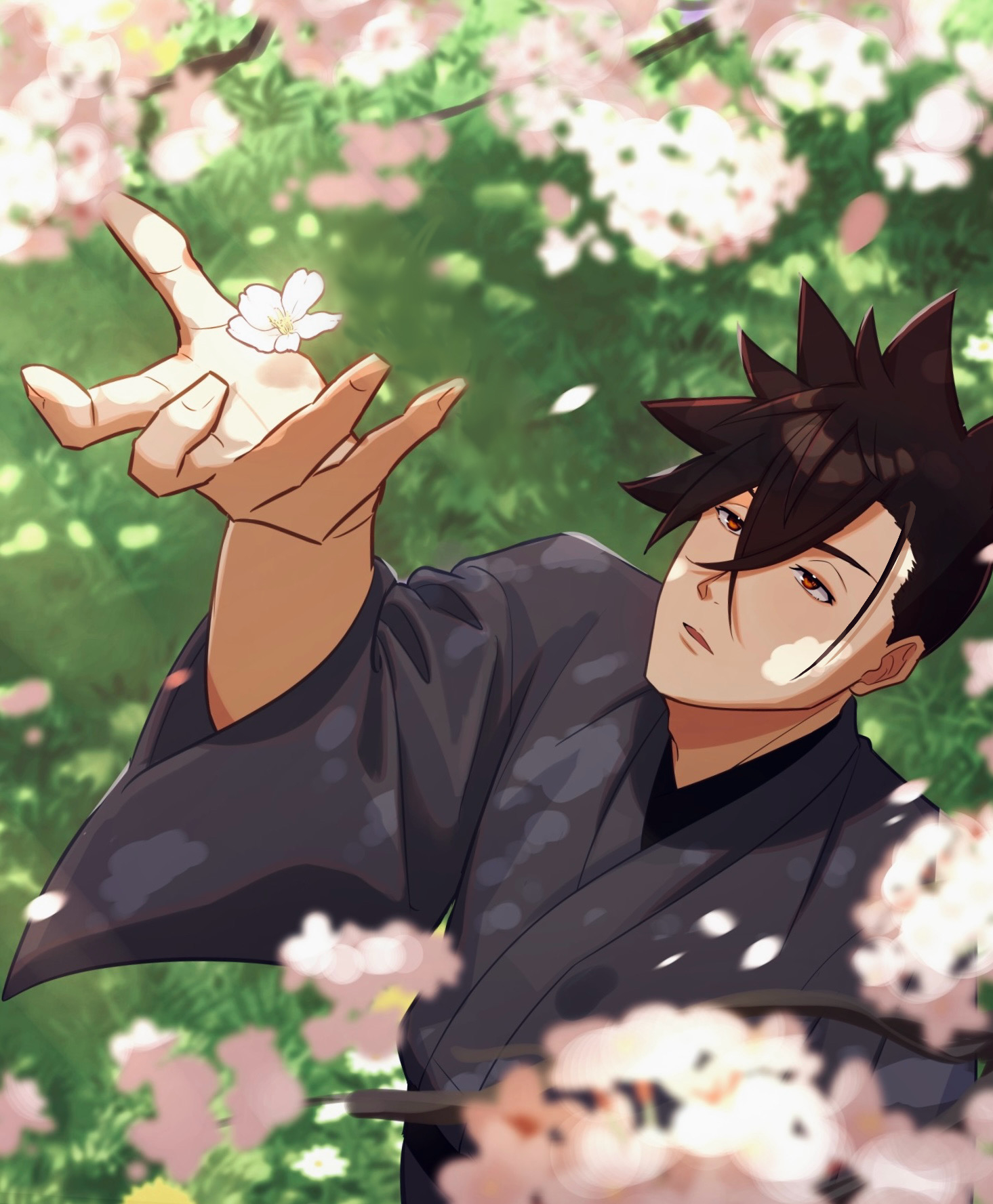 1boy black_hair cherry_blossoms day from_above grass grey_kimono hair_between_eyes highres japanese_clothes kimono kurima_raizou looking_up male_focus nakukaba outdoors petals red_eyes revenger solo spiked_hair wide_sleeves