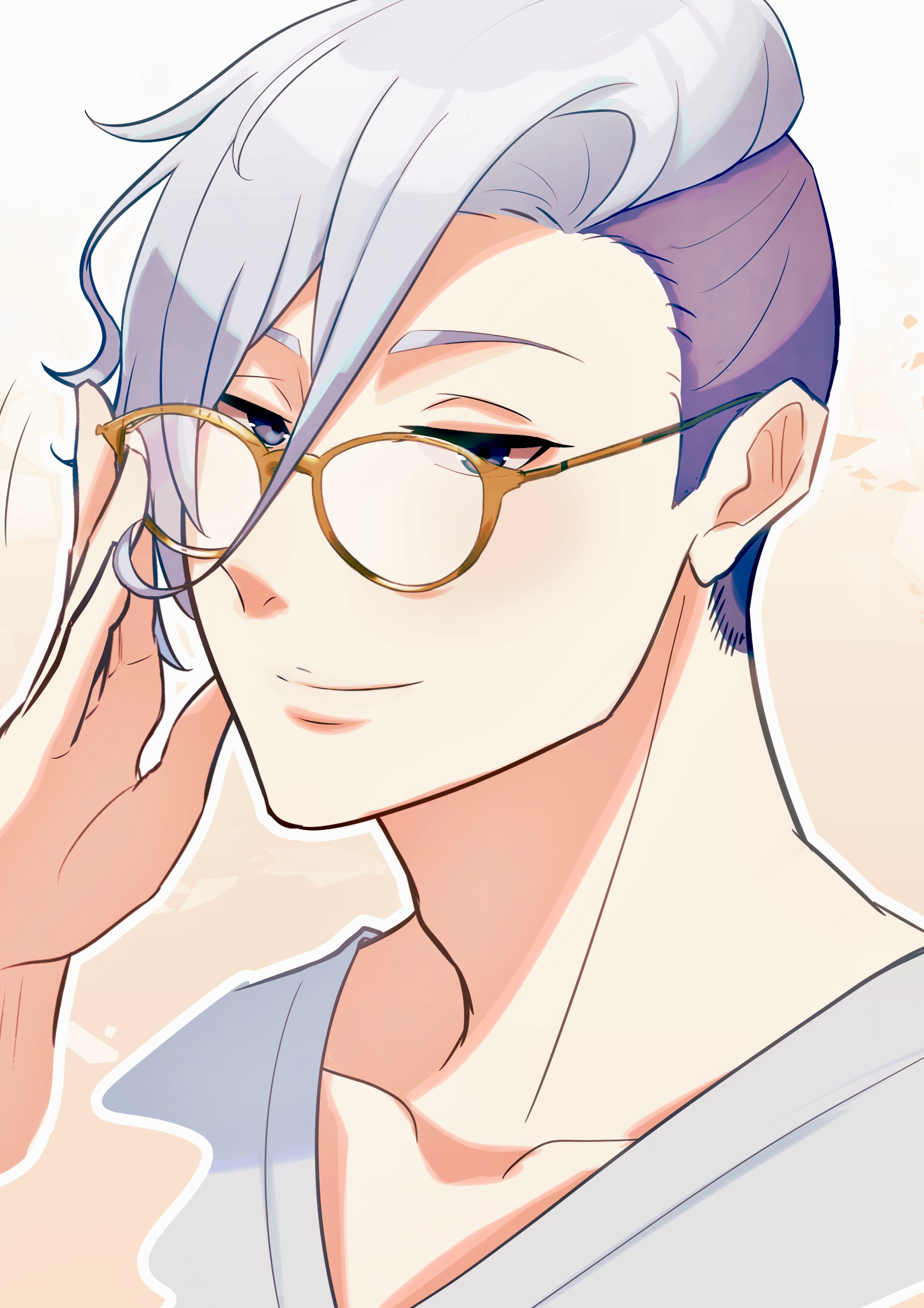 1boy adjusting_eyewear contemporary glasses gradient_background grey_eyes grey_hair hair_between_eyes highres light_smile male_focus nakukaba portrait revenger simple_background smile usui_yuen