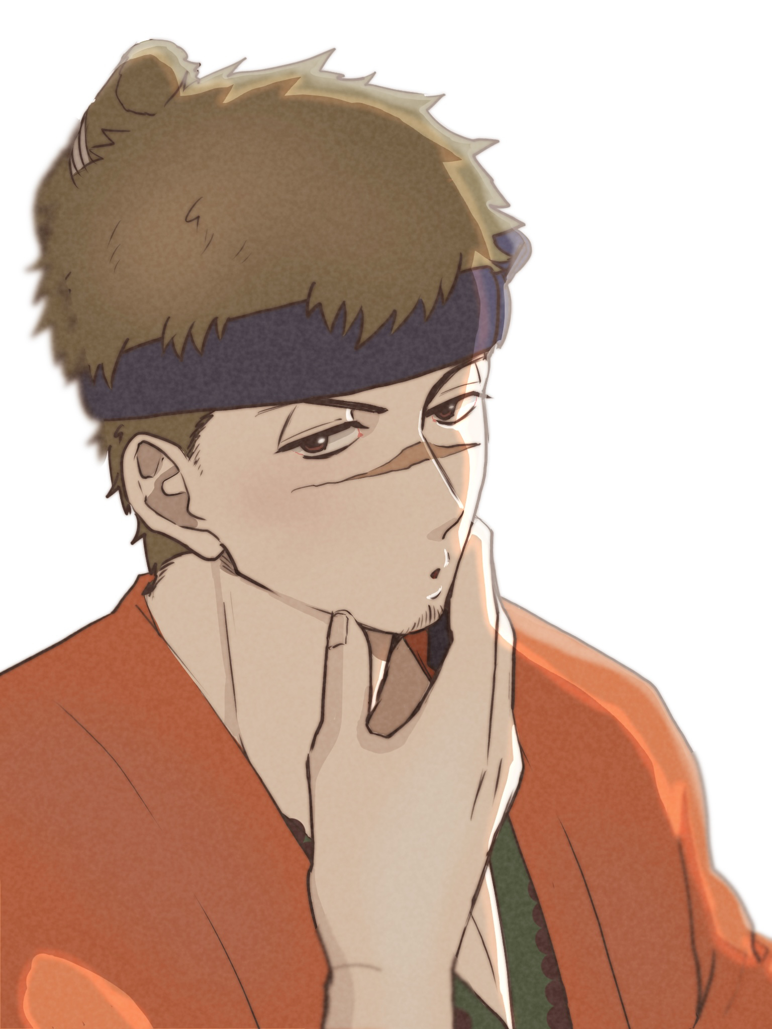 1boy beard_stubble blue_headband brown_eyes brown_hair facial_hair headband highres japanese_clothes kimono looking_at_viewer male_focus orange_kimono ostenlicht revenger scar scar_on_face scar_on_nose short_hair simple_background solo souji_(revenger) stubble white_background