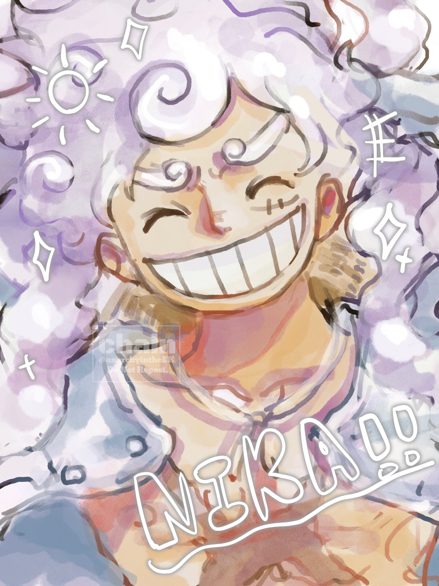 +++ 1boy ^_^ anarchyintheek closed_eyes commentary_request gear_fifth hat highres male_focus monkey_d._luffy one_piece open_clothes open_shirt scar scar_on_chest scar_on_face shirt shorts smile solo straw_hat thick_eyebrows upper_body white_hair white_shirt white_shorts