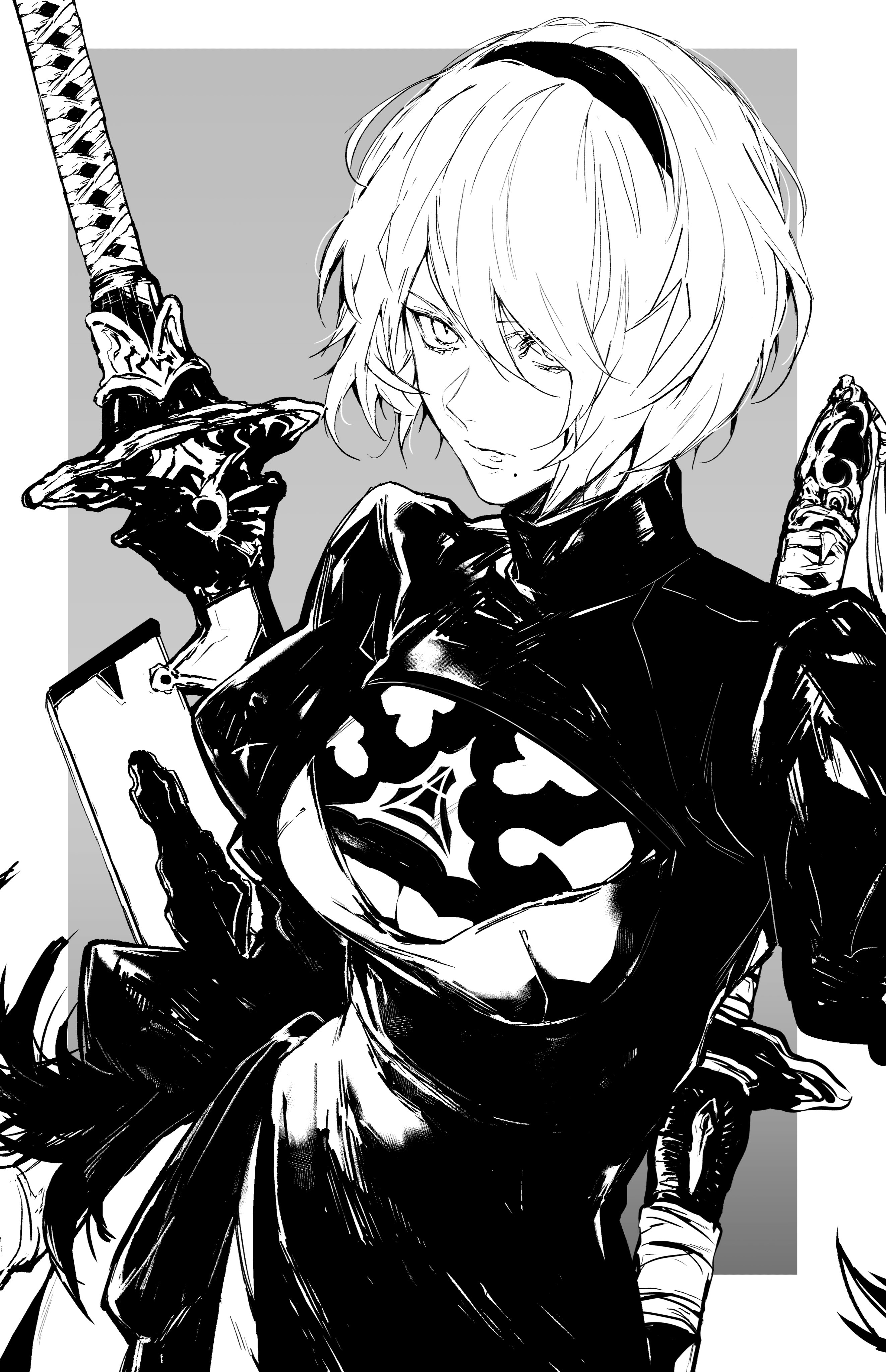 1girl 2b_(nier:automata) absurdres black_dress breasts center_opening cleavage clothing_cutout dress feathers grey_background greyscale headband highres katana looking_at_viewer mole mole_under_mouth monochrome nier:automata nier_(series) nishiii26miii short_hair sideways_glance simple_background solo sword weapon white_hair