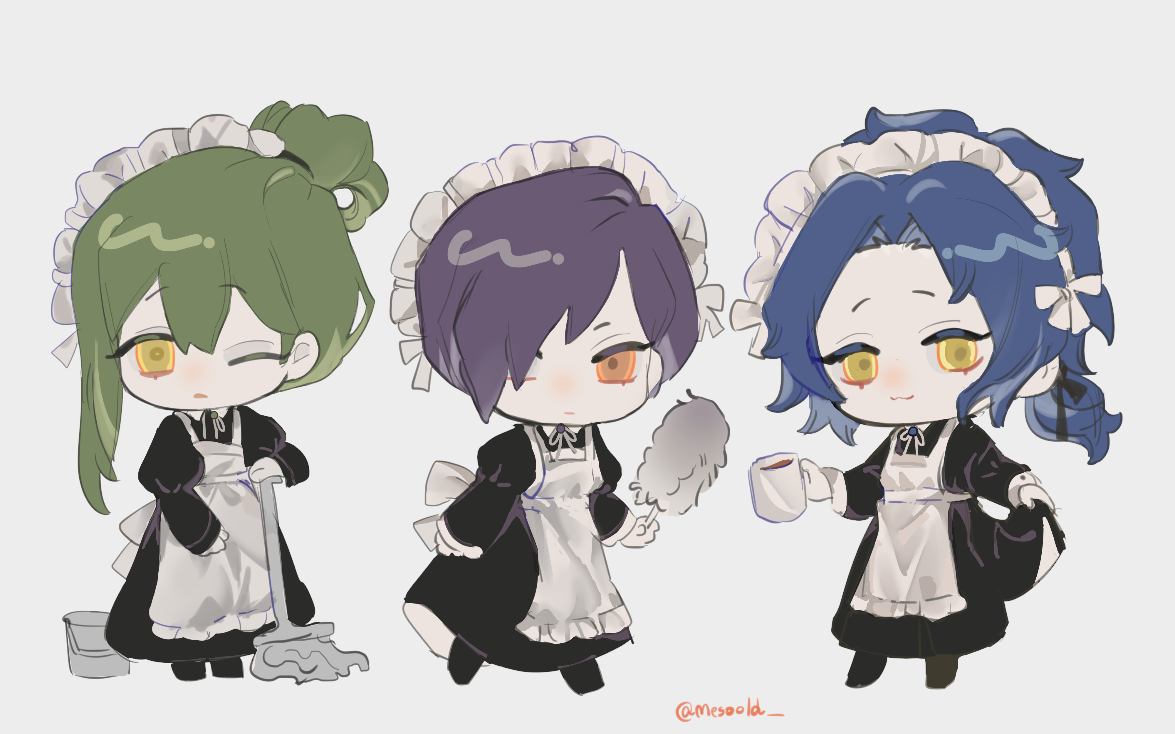 3boys absurdres apron black_dress blue_hair chesed_(project_moon) cup dress duster full_body green_hair hair_over_one_eye hand_up highres holding holding_cup holding_duster holding_mop juliet_sleeves library_of_ruina long_sleeves low_ponytail maid maid_apron maid_headdress mesoold mop mug multiple_boys netzach_(project_moon) parted_bangs ponytail project_moon puffy_sleeves purple_hair simple_background white_apron white_background yesod_(project_moon)
