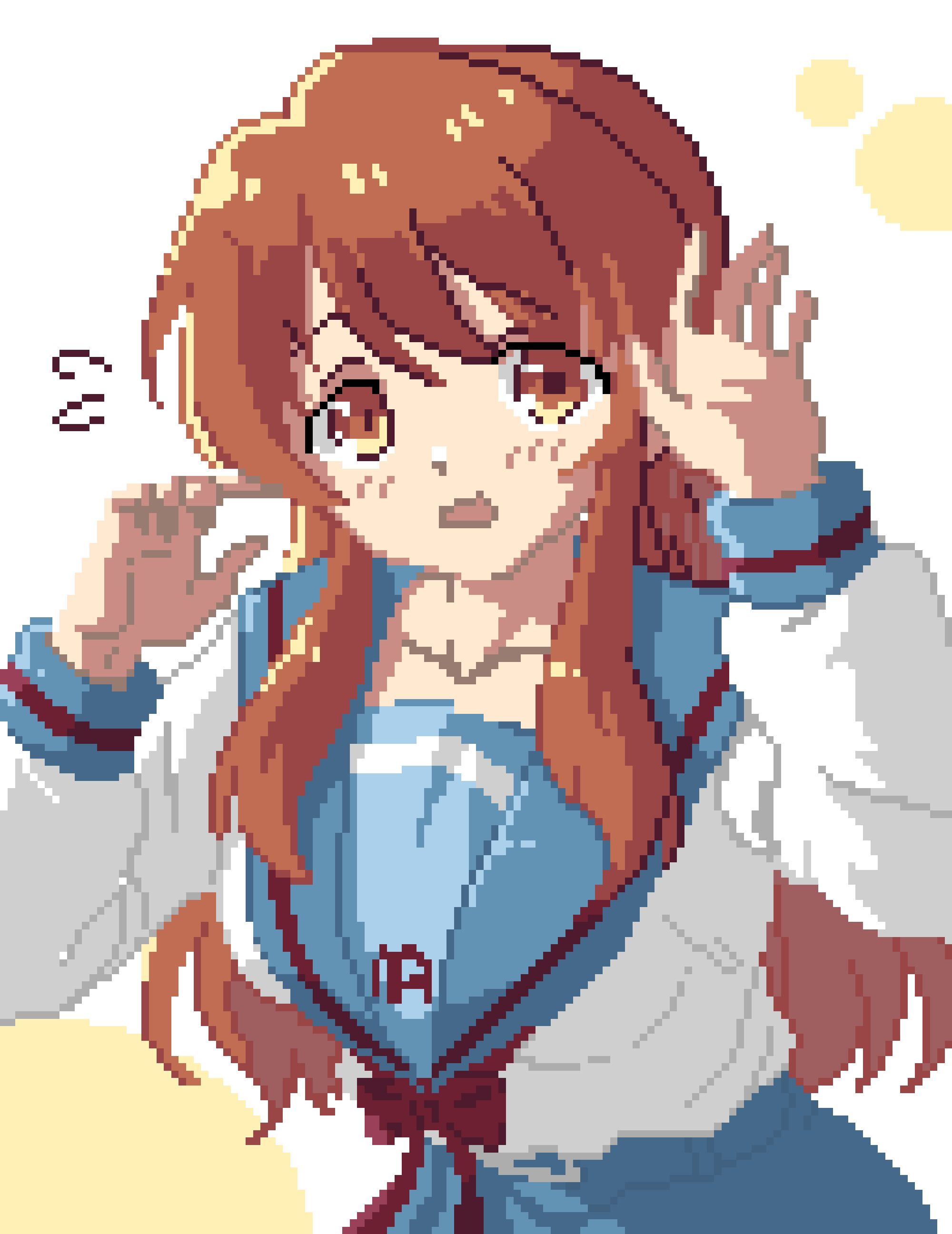 1girl absurdres asahina_mikuru drawfag highres orange_eyes orange_hair pixel_art school_uniform serafuku suzumiya_haruhi_no_yuuutsu