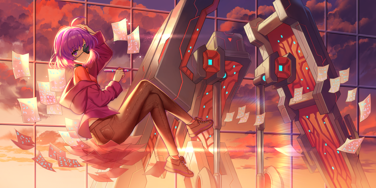 1girl ahoge black_choker black_pants bob_cut choker closed_mouth cloud cloudy_sky commentary crossed_legs dated_commentary denim eyepatch final_gear floating floating_object game_cg hand_on_own_head hiraris holding holding_pen hood hoodie jeans looking_at_viewer murasaki_(final_gear) official_art one_eye_covered pants paper pen pocket purple_eyes purple_hair purple_hood purple_hoodie red_shirt reflection shirt shoes short_hair sitting sky sleeve_cuffs sneakers solo sun_glare sunset window