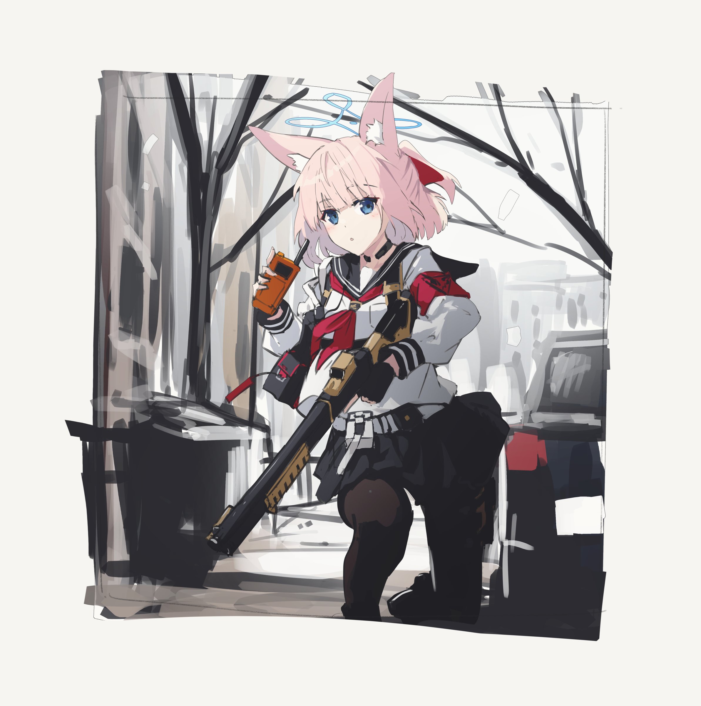 1girl absurdres animal_ear_fluff animal_ears armband belt black_pantyhose black_skirt blue_archive blue_halo blunt_bangs bob_cut fox_ears fox_girl gun hair_ornament hair_ribbon half_updo halo highres holding holding_gun holding_walkie-talkie holding_weapon looking_at_viewer nagishiro_mito neckerchief niko_(blue_archive) pantyhose pink_hair pleated_skirt red_armband red_neckerchief red_ribbon ribbon sailor_collar school_uniform shirt shotgun sidelocks simple_background sketch_background skirt solo walkie-talkie weapon white_background white_shirt