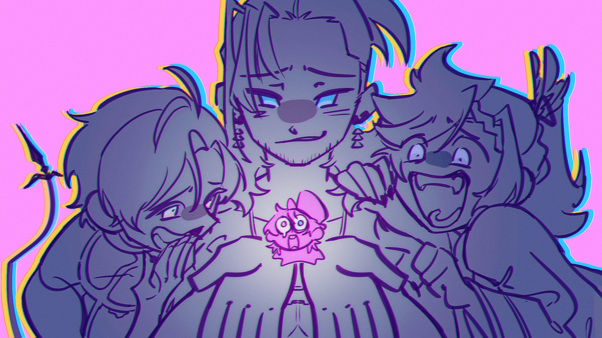 4boys alternate_size banzoin_hakka beard_stubble blue_eyes blue_outline earrings facial_hair feather_hair_ornament feathers gavis_bettel hair_between_eyes hair_ornament hat heterochromia highres holoboisart holostars holostars_english jewelry josuiji_shinri laughing limited_palette looking_at_another machina_x_flayon multiple_boys open_mouth outline pink_background pink_eyes ponytail smile stubble tail teardrop top_hat virtual_youtuber yellow_outline