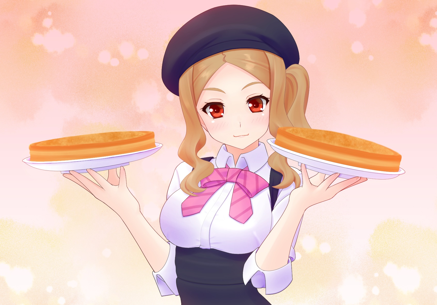 1girl breasts brown_eyes brown_hair closed_mouth dessert ert female_focus food gmk_13 hat highres holding long_hair looking_at_viewer medium_breasts onozuka_hikari solo standing yama_no_susume