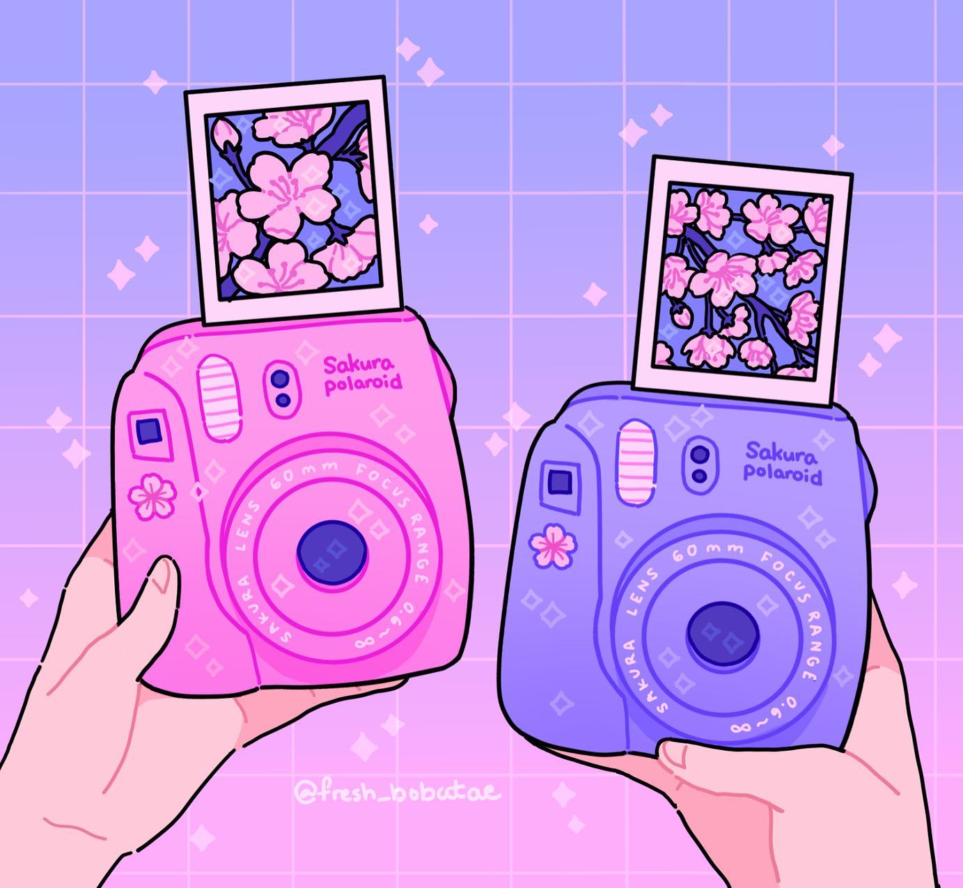 1other camera cherry_blossom_print cherry_blossoms emily_kim floral_print fujifilm gradient_background grid_background highres holding holding_camera limited_palette original out_of_frame pastel_colors pink_background polaroid_photo purple_background purple_theme sparkle twitter_username