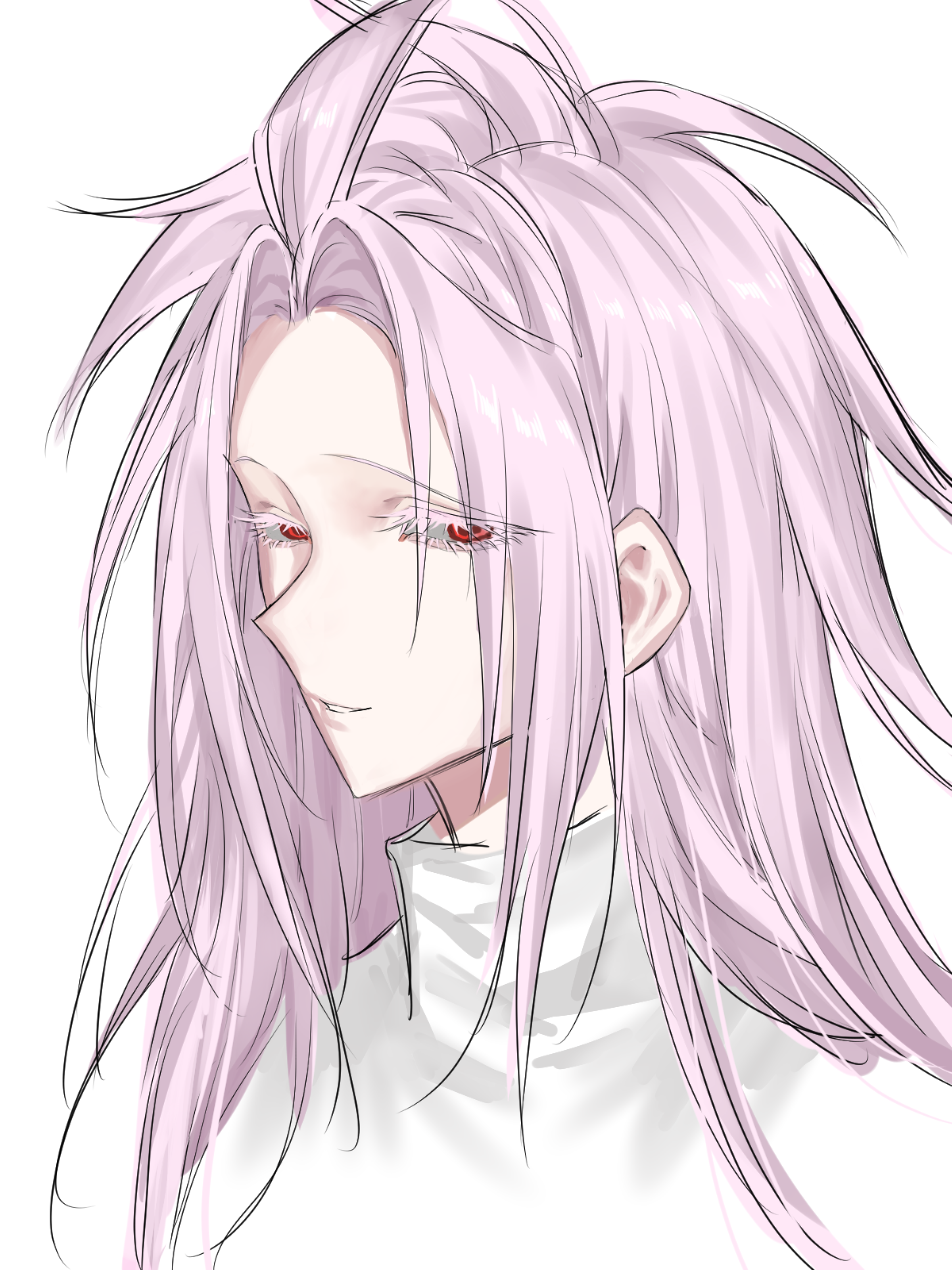 1boy absurdres chinese_commentary colored_eyelashes commentary_request eyelashes hatsutori_hajime highres jcwlg long_hair male_focus parted_bangs pink_hair portrait red_eyes saibou_shinkyoku shirt simple_background smile solo white_background white_shirt