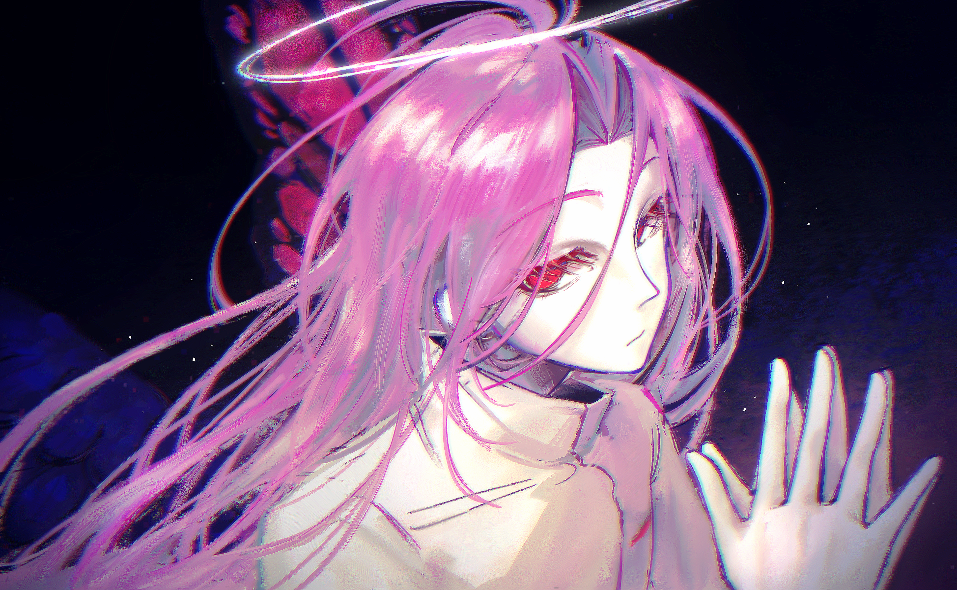 1boy chinese_commentary chromatic_aberration closed_mouth colored_eyelashes commentary_request eyelashes halo hatsutori_hajime highres long_hair male_focus pale_skin parted_bangs pink_hair portrait red_eyes saibou_shinkyoku shirt siyuyuan82128 solo steepled_fingers traditional_halo white_halo white_shirt