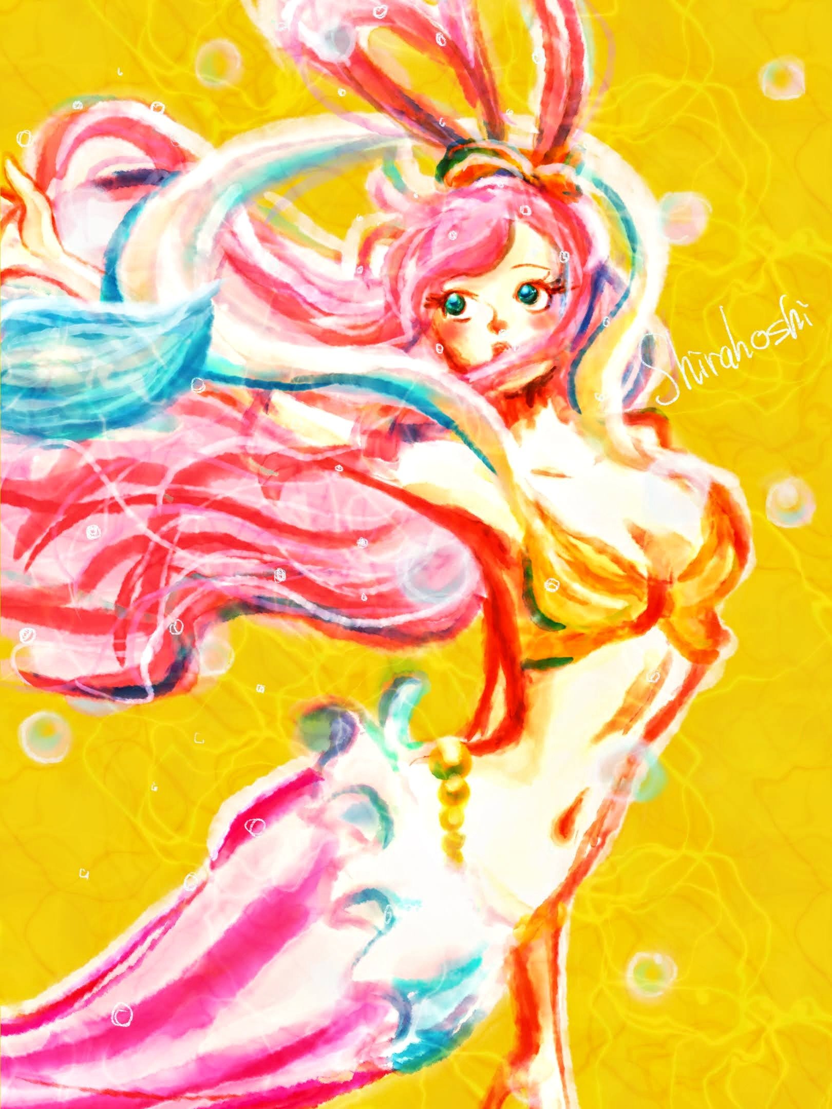 1girl bikini blue_eyes bubble character_name fish_hair_ornament hagoromo hair_ornament half_updo highres long_hair looking_to_the_side mermaid monster_girl navel one_piece oooooogu24 outstretched_arm shawl shirahoshi sidelocks solo swept_bangs swimsuit very_long_hair yellow_background yellow_bikini