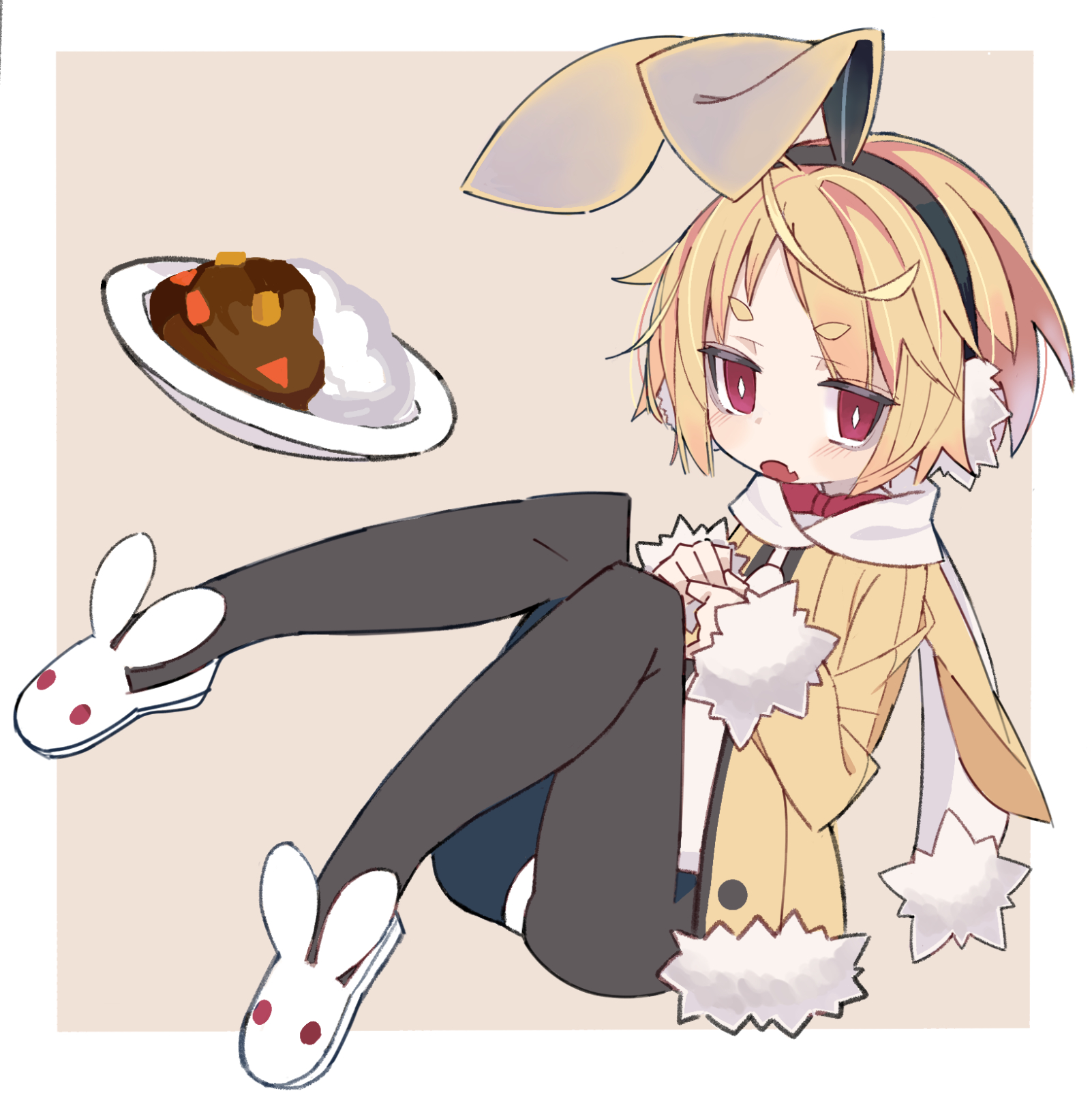 1girl animal_ears animal_slippers black_hairband blonde_hair border bow bowtie brown_background bunny_slippers commentary curry curry_rice disgaea earmuffs fake_animal_ears fang food full_body fur-trimmed_jacket fur-trimmed_sleeves fur_trim hairband hands_up happy_cream highres jacket looking_at_viewer makai_senki_disgaea_5 open_mouth outside_border pantyhose rabbit_earmuffs rabbit_ears red_bow red_bowtie red_eyes rice scarf short_eyebrows short_hair simple_background skin_fang slippers solo thick_eyebrows usalia_(disgaea) white_border white_scarf yellow_jacket