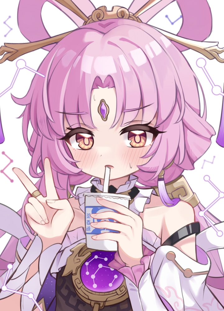 1girl bare_shoulders blush bow-shaped_hair breasts chinese_commentary collarbone commentary_request constellation cup curtained_hair detached_sleeves disposable_cup dress drinking_straw feixianji_(hairstyle) forehead_jewel frilled_dress frills fu_xuan_(honkai:_star_rail) furrowed_brow gem gululu_w hair_ornament hair_rings hairpin holding holding_cup honkai:_star_rail honkai_(series) jewelry long_hair looking_at_viewer low_twintails open_mouth partial_commentary pink_hair purple_gem ring simple_background small_breasts solo straight-on sweat tassel twintails v variant_set white_background