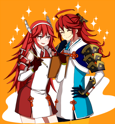 1boy 1girl ahoge armor caeldori_(fire_emblem) father_and_child father_and_daughter fire_emblem fire_emblem_fates hair_between_eyes hio141 japanese_armor long_hair lowres messy_hair nintendo open_mouth parent_and_child ponytail red_eyes red_hair subaki_(fire_emblem) winged_hair_ornament