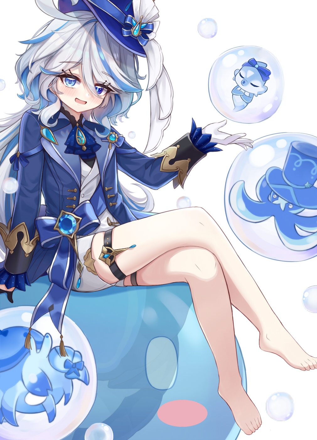 1girl :d animal ascot asymmetrical_gloves bare_legs barefoot black_gloves black_shirt blue_ascot blue_eyes blue_gem blue_hair blue_jacket blush bubble chinese_commentary clothed_animal colored_inner_hair commentary crossed_legs frilled_shirt_collar frills from_side furina_(genshin_impact) gem genshin_impact gloves gululu_w hair_between_eyes hand_up hat hermit_crab heterochromia highres jacket legs long_eyelashes looking_at_viewer mismatched_gloves multicolored_hair object_floating_above_hand octopus open_clothes open_jacket open_mouth plantar_flexion shirt shorts simple_background sitting_on_animal skindentation smile solo streaked_hair thigh_strap tilted_headwear top_hat vest vision_(genshin_impact) waistcoat white_background white_gloves white_hair white_shorts