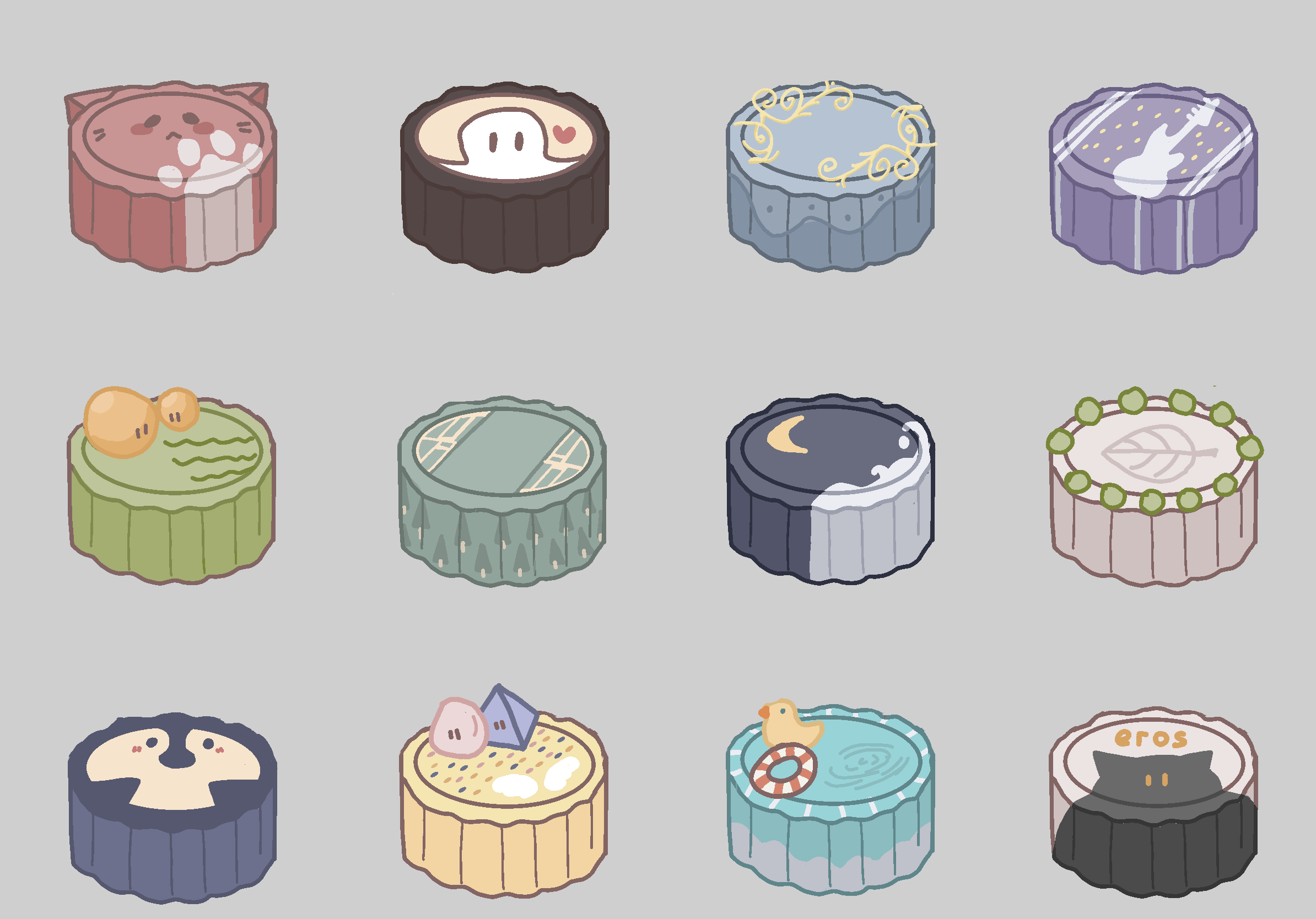 bird cat crescent duck food food_focus ghost grey_background guitar highres instrument leaf mid-autumn_festival mooncake no_humans objectification original simple_background sjutton still_life swim_ring