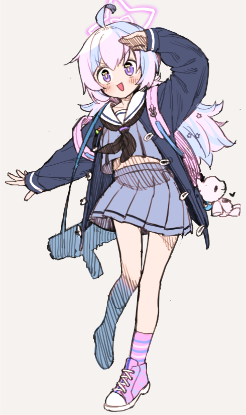 1girl ahoge black_jacket black_neckerchief blue_archive blush grey_serafuku grey_skirt hair_between_eyes heart jacket long_hair long_sleeves monaka_ooji neckerchief open_clothes open_jacket open_mouth pink_shoes pleated_skirt purple_eyes purple_hair reisa_(blue_archive) sailor_collar school_uniform serafuku shoes simple_background skirt smile socks solo striped_clothes striped_socks twintails white_background white_sailor_collar