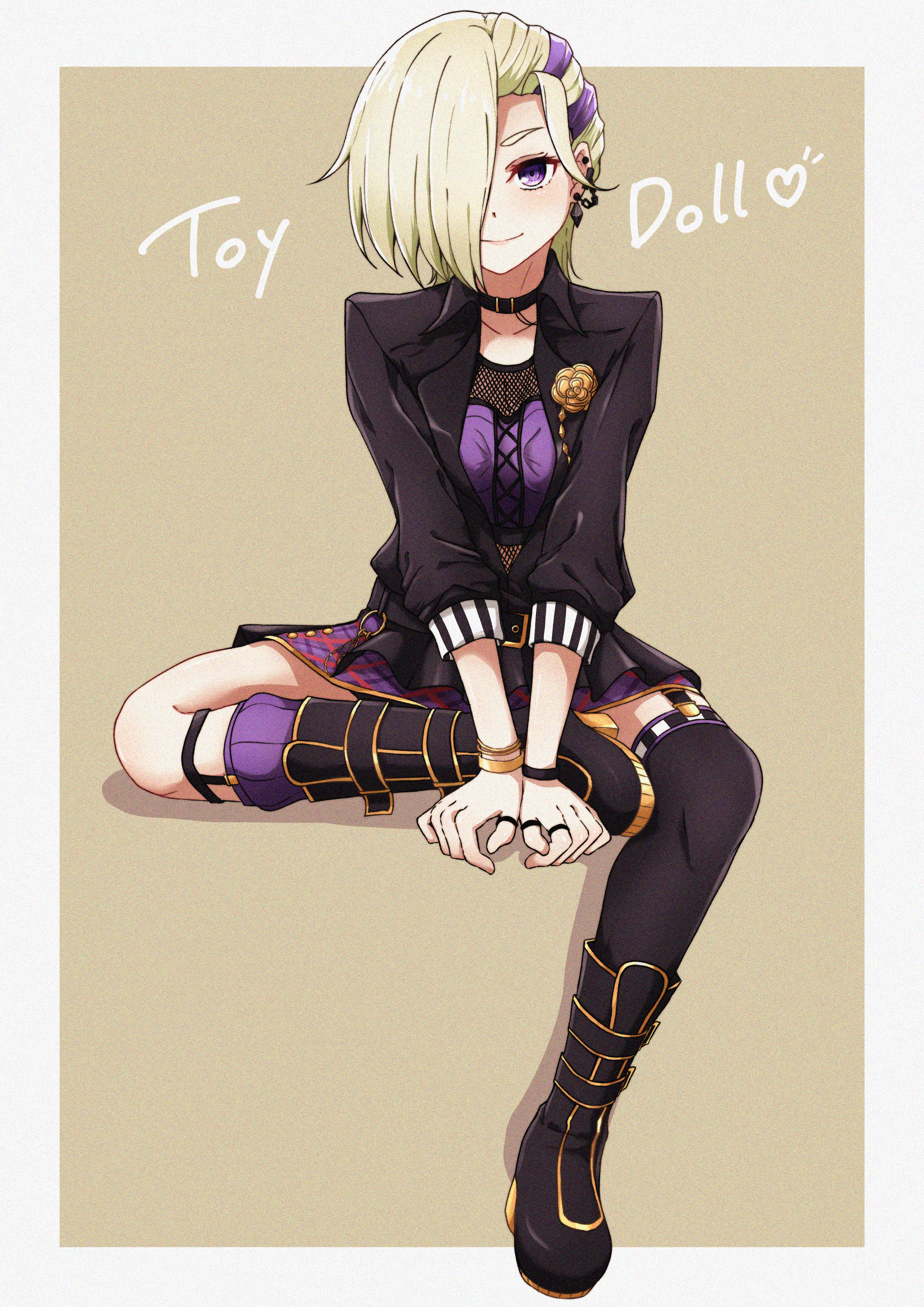 1girl absurdres black_boots black_choker black_jacket black_skirt black_thighhighs blonde_hair boots bracelet choker closed_mouth collarbone commentary commentary_request ear_piercing earrings english_commentary english_text hair_over_one_eye highres jacket jewelry knee_boots koukoutou_(seikoutoutei) layered_skirt long_sleeves looking_at_viewer love_live! love_live!_nijigasaki_high_school_idol_club mia_taylor mixed-language_commentary multicolored_hair official_alternate_hairstyle one_eye_covered outside_border piercing purple_eyes purple_hair ring short_hair single_thighhigh sitting skirt smile solo song_name thighhighs toy_doll_(love_live!) wristband
