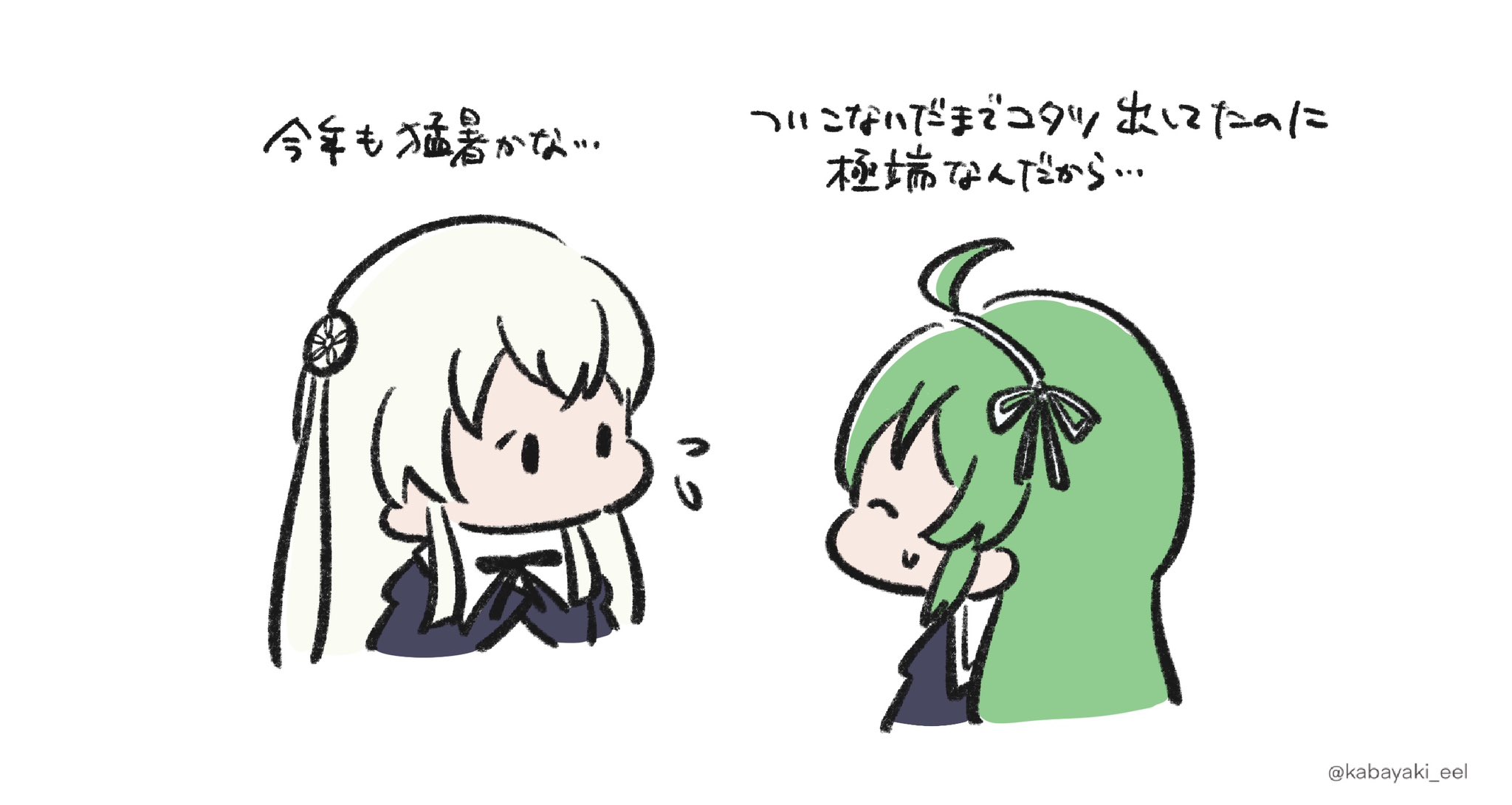 2girls ^_^ ahoge arms_at_sides assault_lily black_ribbon bow_hairband chibi closed_eyes cropped_jacket cropped_torso egawa_kusumi facing_another flower flying_sweatdrops green_hair hair_flower hair_ornament hair_ribbon hairband highres juliet_sleeves kabayaki_(kabayaki_eel) long_hair long_sleeves looking_at_another multiple_girls neck_ribbon no_mouth profile puffy_sleeves ribbon school_uniform solid_oval_eyes sweatdrop tanaka_ichi translated twitter_username upper_body white_hair white_hairband white_ribbon yurigaoka_girls_academy_school_uniform