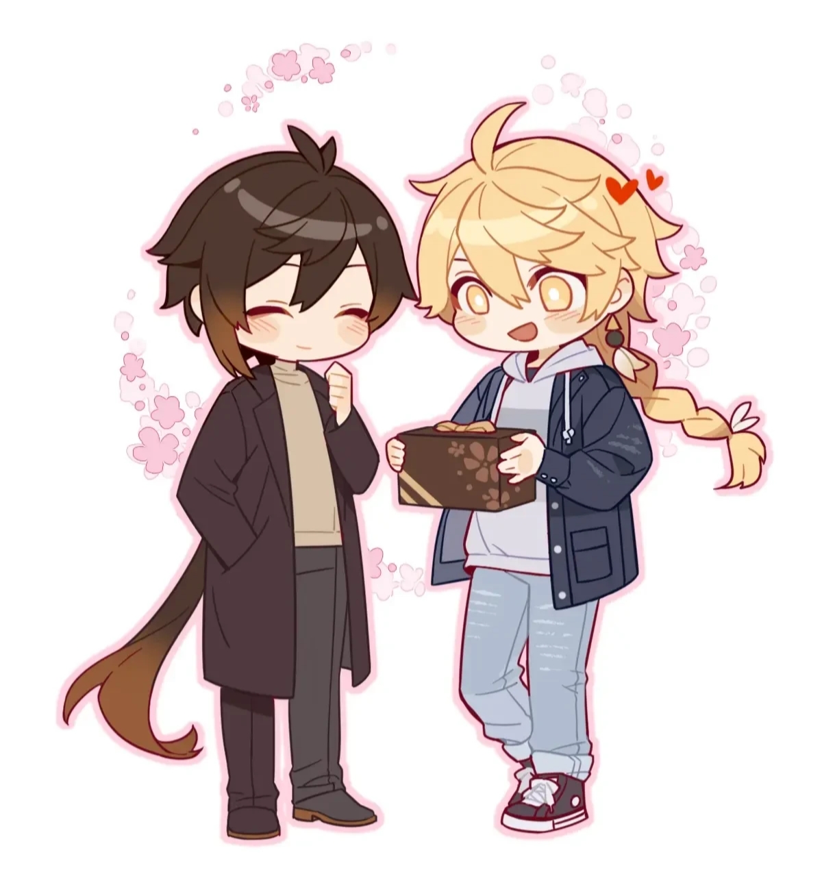 2boys aether_(genshin_impact) alternate_costume box chibi genshin_impact gift gift_box highres lofter lofter_logo lofter_username maomi233 multiple_boys smile white_background zhongli_(genshin_impact)