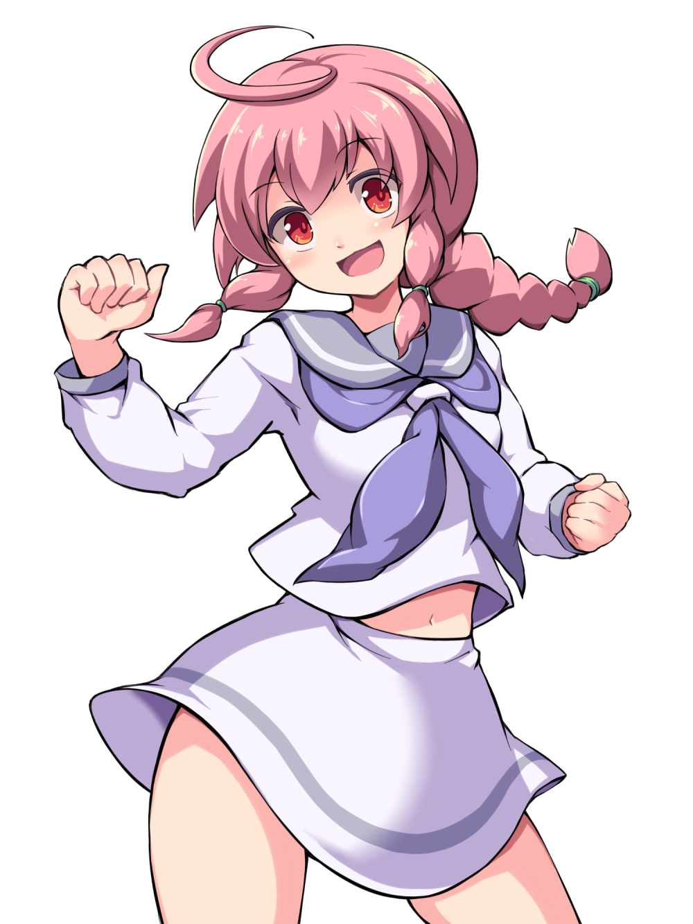 100%_orange_juice 1girl ahoge blue_sailor_collar blush braid commentary_request contrapposto cowboy_shot highres long_sleeves looking_at_viewer midriff midriff_peek miniskirt navel neckerchief nisemono_faker open_mouth pink_hair qp_shooting red_eyes sailor_collar school_uniform serafuku shirt short_hair skirt solo syura_(orange_juice) transparent_background