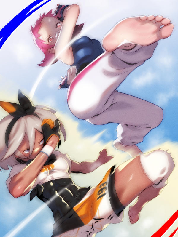 2girls abs bandaid bandaid_on_face bandaid_on_nose barefoot bea_(pokemon) blue_eyes blue_shirt bodysuit bodysuit_under_clothes breasts commission cracking_knuckles crop_top dark-skinned_female dark_skin duel fingerless_gloves gloves grey_hair jumping kicking knee_pads leg_up maylene_(pokemon) multiple_girls nintendo open_mouth pants pink_eyes pink_hair pixiv_commission pokemon pokemon_dppt pokemon_swsh shirt short_hair shorts sleeveless sleeveless_shirt small_breasts soles soon_(c-u-soon) toned toned_female track_pants white_pants white_shirt white_shorts