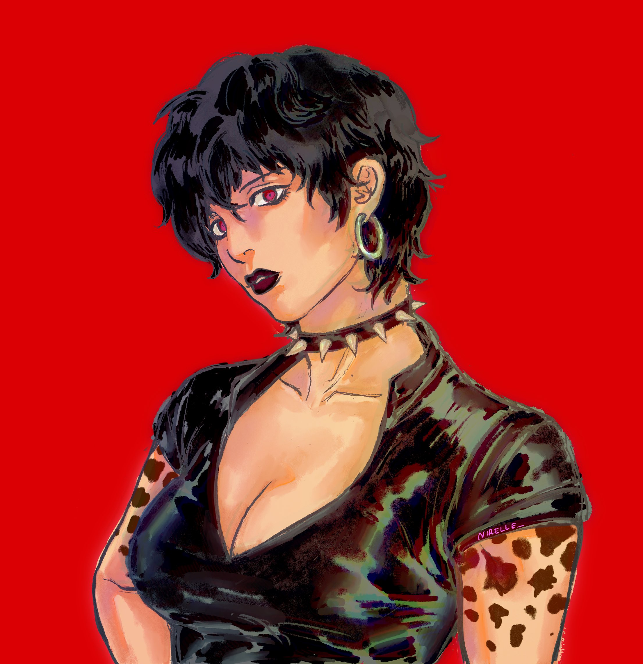 1girl arm_tattoo artist_name black_hair black_lips choker commentary doll_(one_piece) earrings english_commentary eyelashes hand_on_own_hip highres jewelry leather_shirt nirelle_art one_piece red_background red_eyes short_hair simple_background solo spiked_choker spikes tattoo upper_body