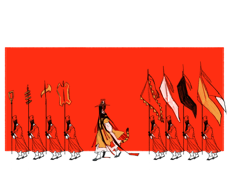 6+boys animal_ears arms_behind_back dream_tiger_(govy9807) flag full_body gat_(hat) hanbok hat hiryuu_(kugelcruor) holding humanization korean_clothes limited_palette long_sleeves looking_to_the_side male_focus multiple_boys orange_hanbok original red_background simple_background tail tiger_boy tiger_ears tiger_tail walking