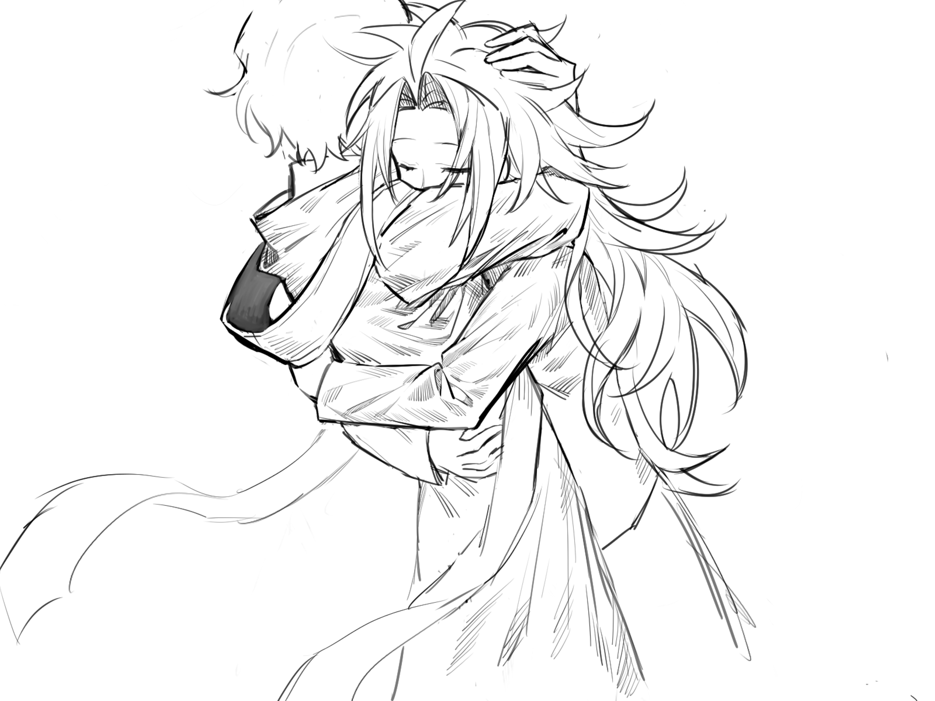 2boys absurdres ahoge chinese_commentary closed_eyes commentary_request greyscale hatsutori_hajime highres hug jcwlg long_hair long_sleeves male_focus monochrome multiple_boys parted_bangs saibou_shinkyoku short_hair simple_background stole utsugi_noriyuki white_background