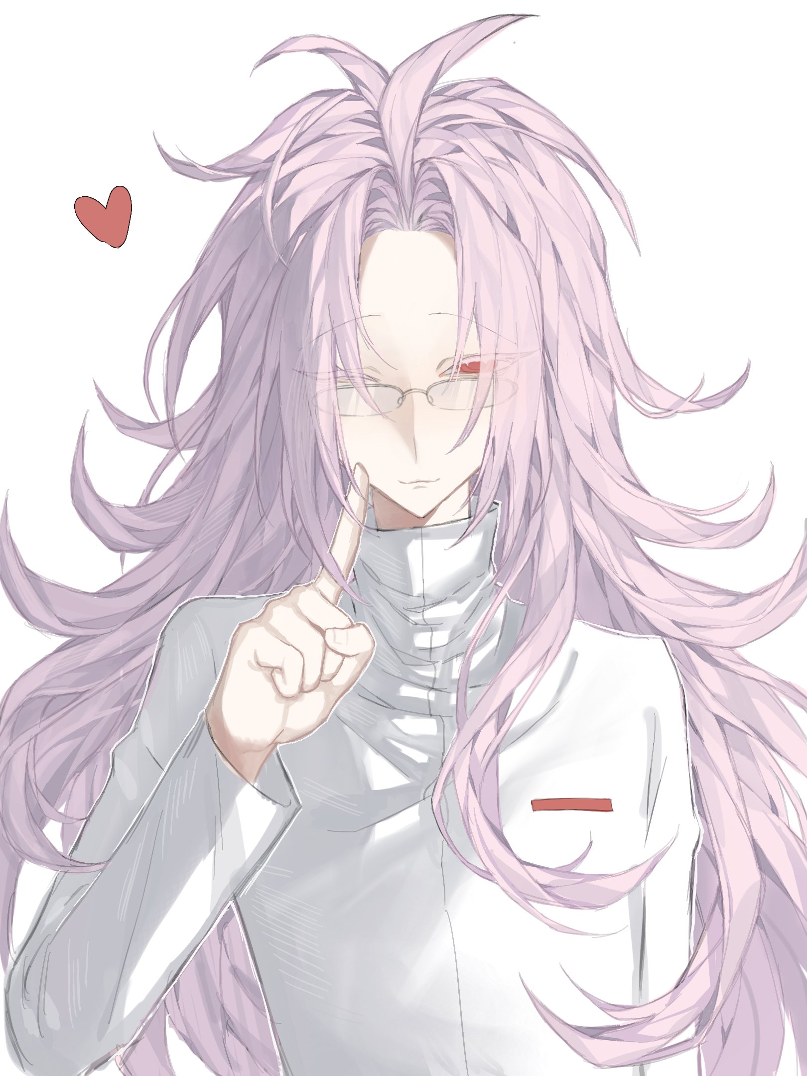 1boy ahoge chinese_commentary closed_mouth colored_eyelashes commentary_request finger_to_cheek glasses hatsutori_hajime heart highres jcwlg long_hair long_sleeves looking_at_viewer male_focus one_eye_closed parted_bangs pink_hair red_eyes saibou_shinkyoku shirt simple_background smile solo white_background white_shirt