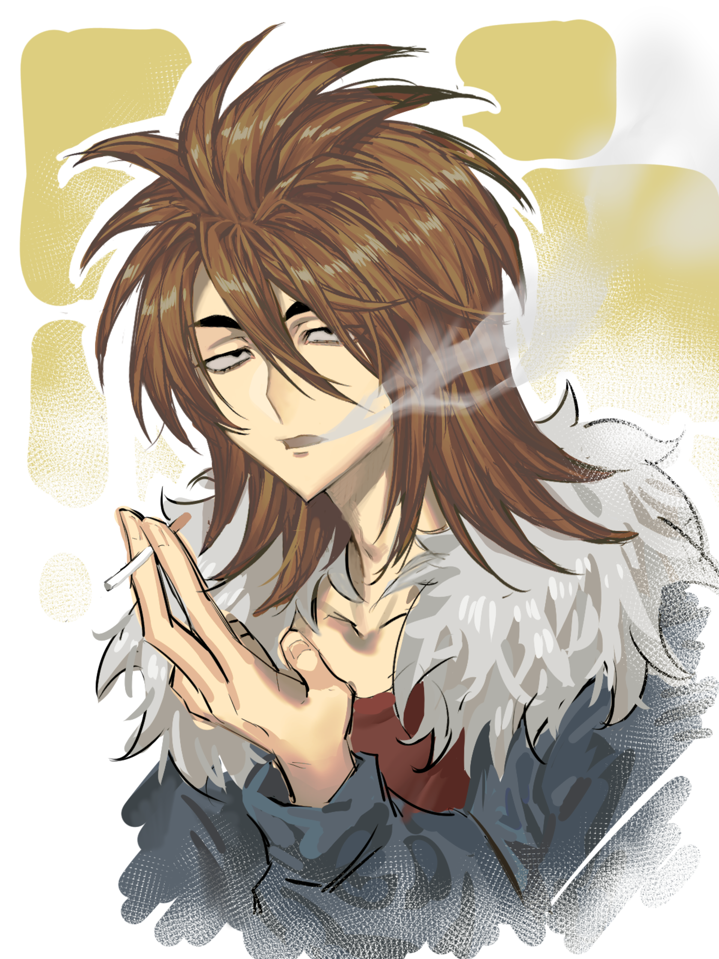 1boy absurdres blowing_smoke blue_jacket brown_hair chinese_commentary cigarette commentary_request fur-trimmed_jacket fur_trim hair_between_eyes highres holding holding_cigarette isoi_reiji jacket jcwlg long_sleeves male_focus medium_hair open_clothes open_jacket open_mouth red_shirt saibou_shinkyoku sanpaku shirt smoke solo