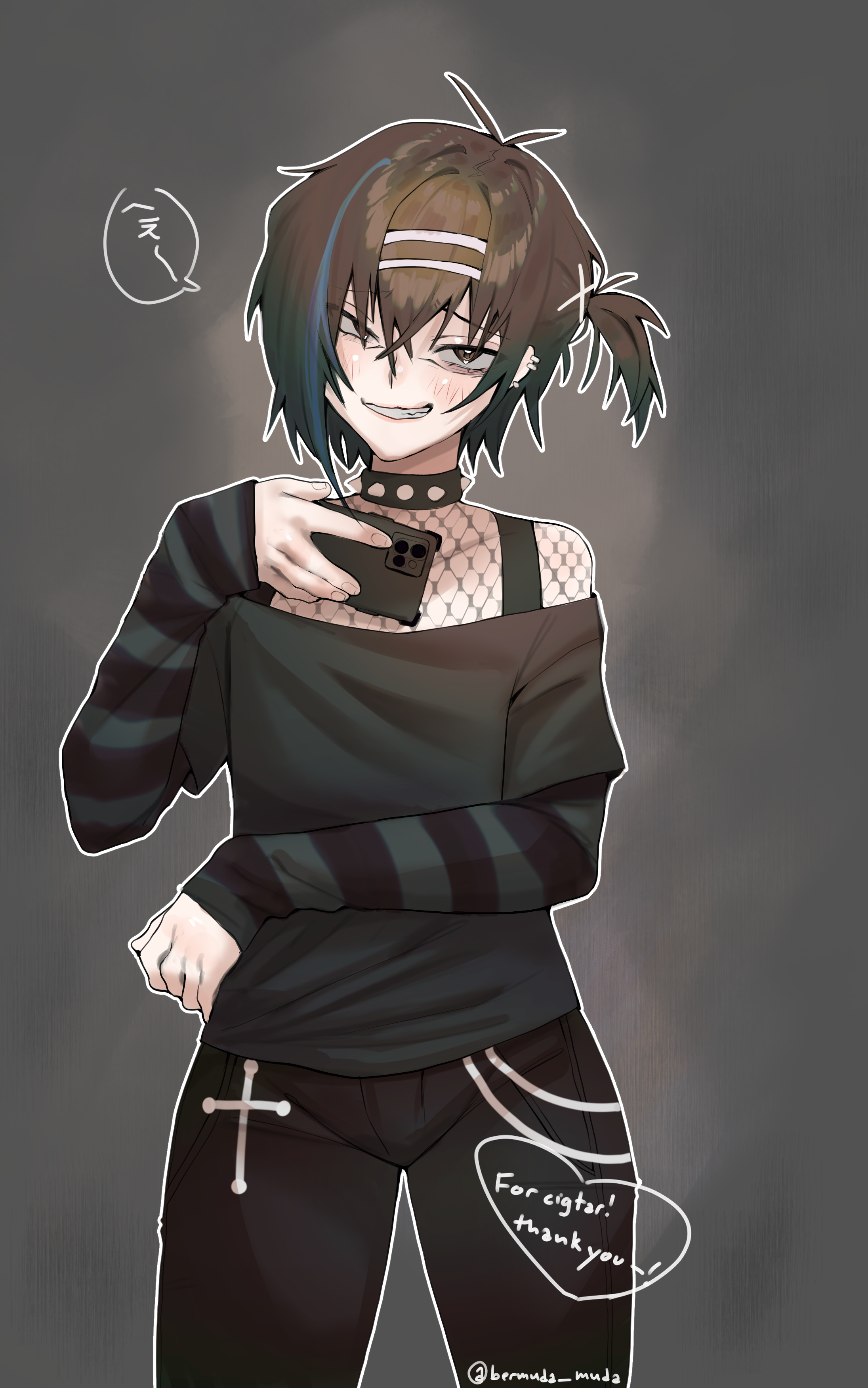 1boy absurdres antenna_hair artist_name bags_under_eyes bermuda_muda black_pants black_shirt blush choker cross colored_bangs ear_ornament fishnet_top fishnets furrowed_brow gradient_background grin hair_between_eyes hair_ornament heart highres holding holding_phone long_sleeves looking_at_viewer male_focus open_mouth original pants phone shirt smile solo speech_bubble spiked_choker spikes striped_clothes teeth trap twitter_username x_hair_ornament