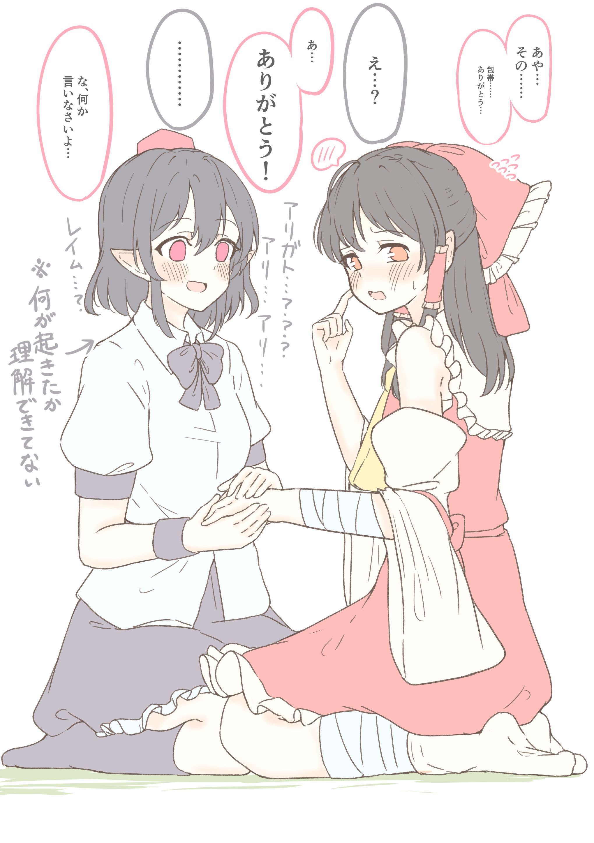 2girls absurdres ascot bandaged_leg bandages black_bow black_bowtie black_hair black_skirt black_socks blush bow bowtie brown_hair collared_shirt commentary_request detached_sleeves frilled_bow frilled_hair_tubes frills hair_bow hair_tubes hakurei_reimu hat highres holding_hands long_hair multiple_girls missing_wings open_mouth pointy_ears red_bow red_eyes red_hat red_skirt seele_(chanseele0128) seiza shameimaru_aya shirt short_sleeves sitting skirt skirt_set socks speech_bubble sweatdrop tokin_hat touhou translation_request white_shirt yellow_ascot