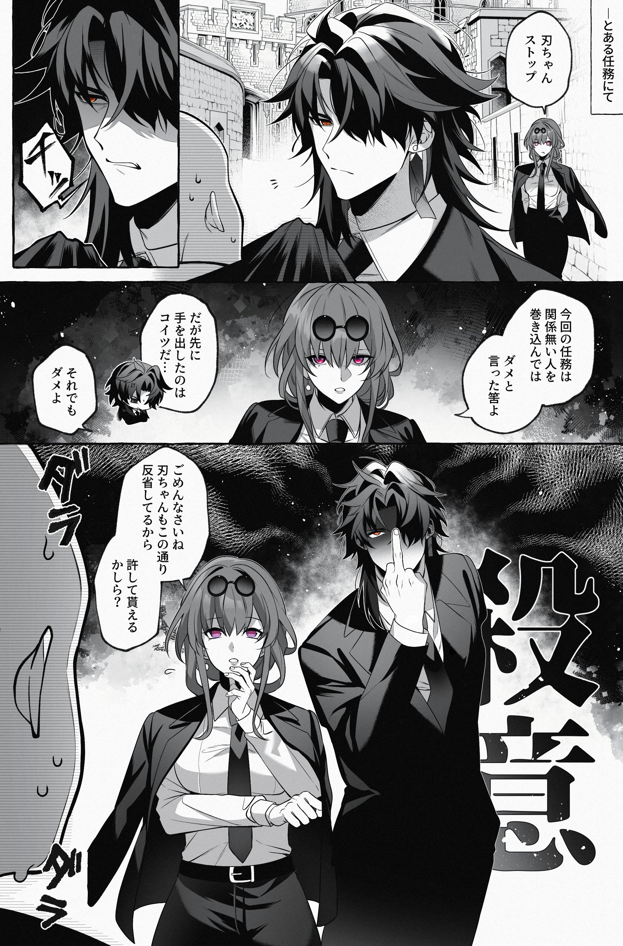 1girl 2boys absurdres alternate_costume belt black_belt black_necktie black_suit blade_(honkai:_star_rail) blade_(jepella_rebellion)_(honkai:_star_rail) breasts business_suit comic formal_clothes greyscale highres honkai:_star_rail honkai_(series) jacket kafka_(honkai:_star_rail) medium_breasts middle_finger monochrome multiple_boys necktie pant_suit pants red_eyes speech_bubble suit suit_jacket sweat translation_request tune_oekk