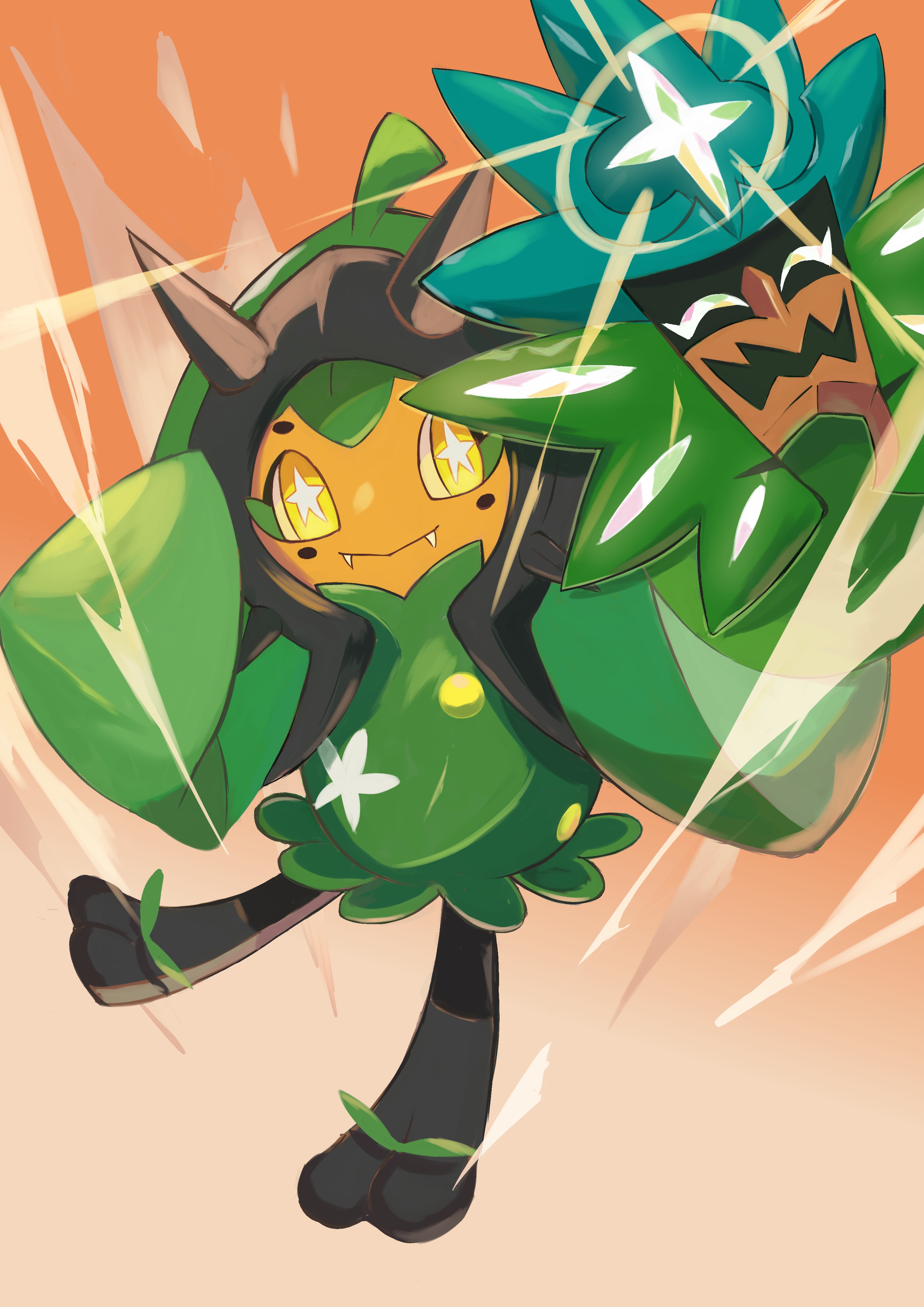absurdres bright_pupils closed_mouth commentary_request dusk_poke27 fangs fangs_out highres holding holding_mask legs_apart mask nintendo ogerpon orange_background pokemon pokemon_(creature) solo symbol-shaped_pupils white_pupils yellow_eyes