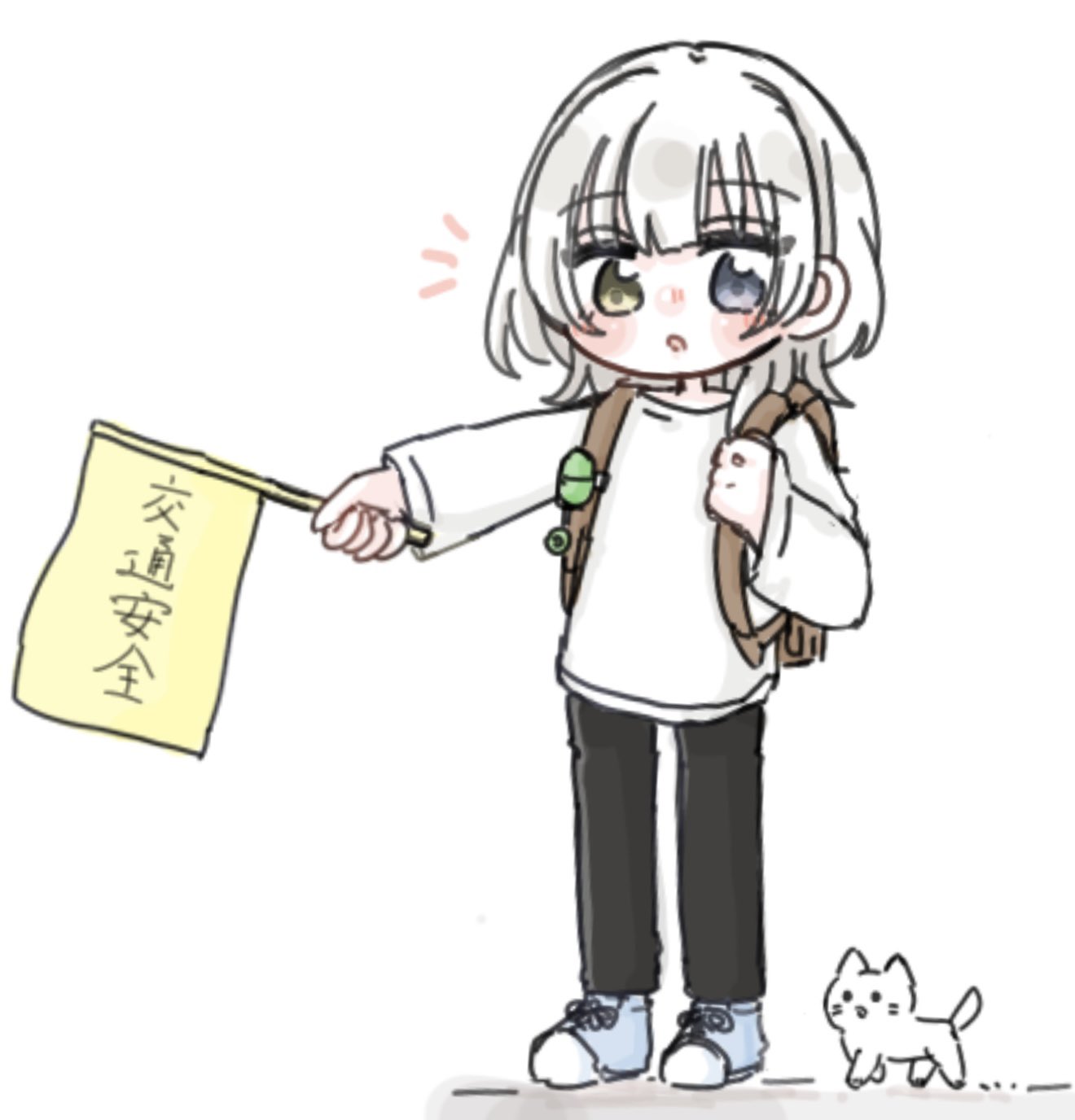 1girl backpack bag bang_dream! bang_dream!_it's_mygo!!!!! black_pants blonde_hair blue_eyes blue_footwear cat commentary flag heterochromia highres holding holding_flag kaname_raana long_sleeves looking_at_viewer medium_hair notice_lines open_mouth pants same_(same_d4) shirt simple_background solo white_background white_cat white_hair white_shirt