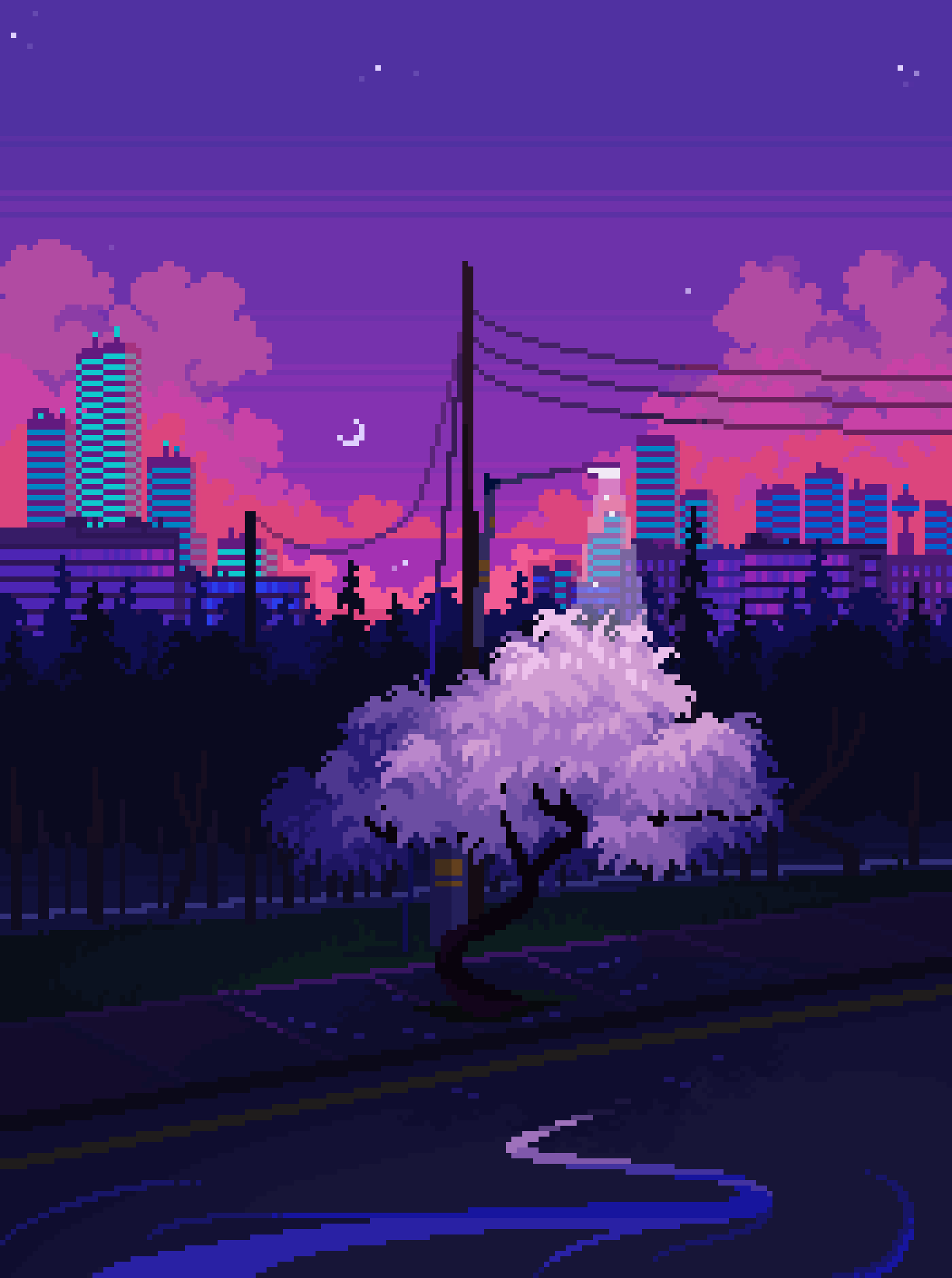 building city cloud commentary crescent_moon english_commentary highres jubilee_(8pxl) moon night no_humans original outdoors pixel_art power_lines purple_clouds purple_sky road scenery sky skyline tree utility_pole