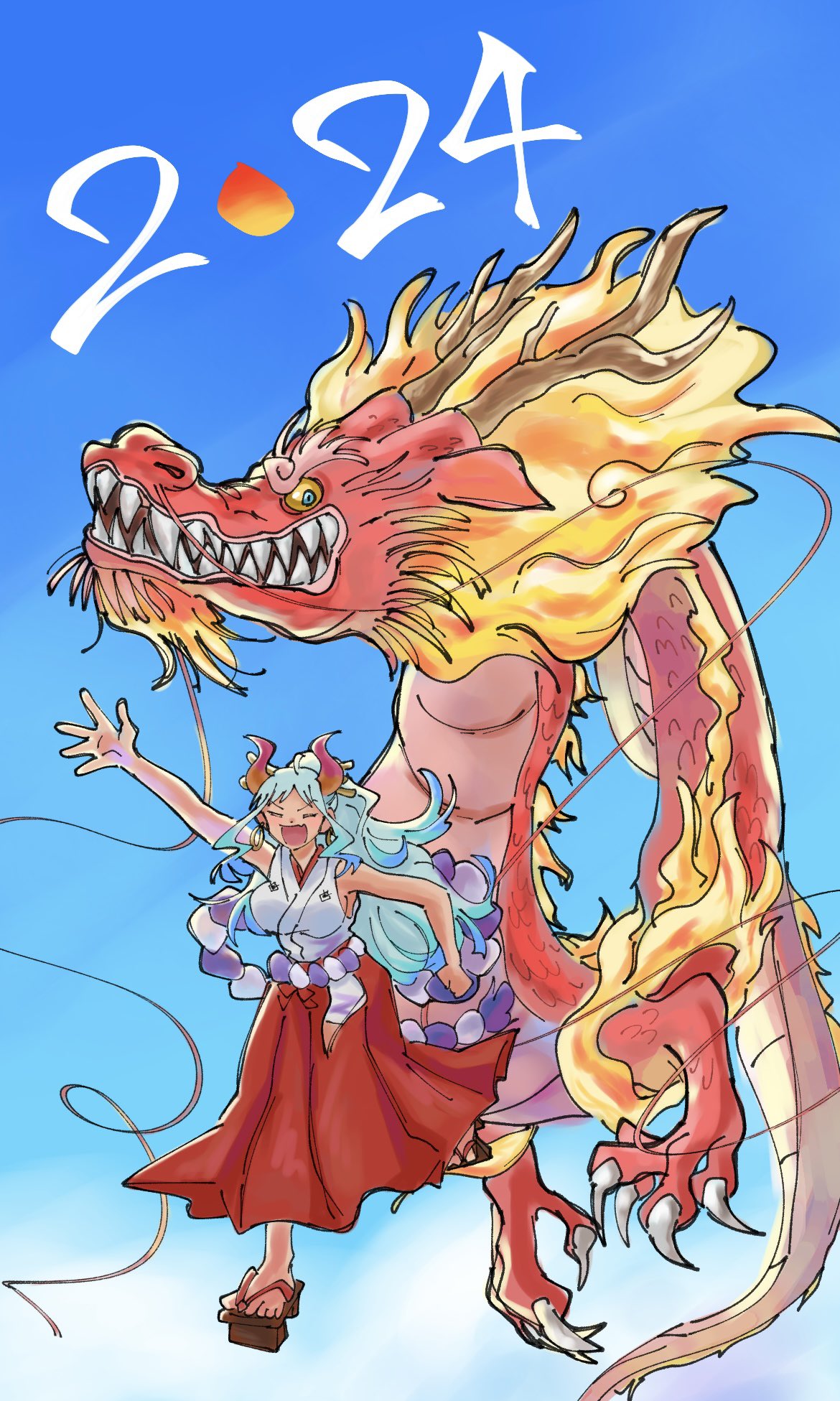0h_my_god 1boy 1girl 2024 ^_^ alternate_form claws closed_eyes dragon earrings full_body geta hakama highres horns japanese_clothes jewelry kimono kouzuki_momonosuke one_piece open_mouth ponytail red_hakama red_horns rope running sharp_teeth shimenawa sidelocks sky sleeveless sleeveless_kimono teeth thick_eyebrows waving whiskers white_kimono yamato_(one_piece)