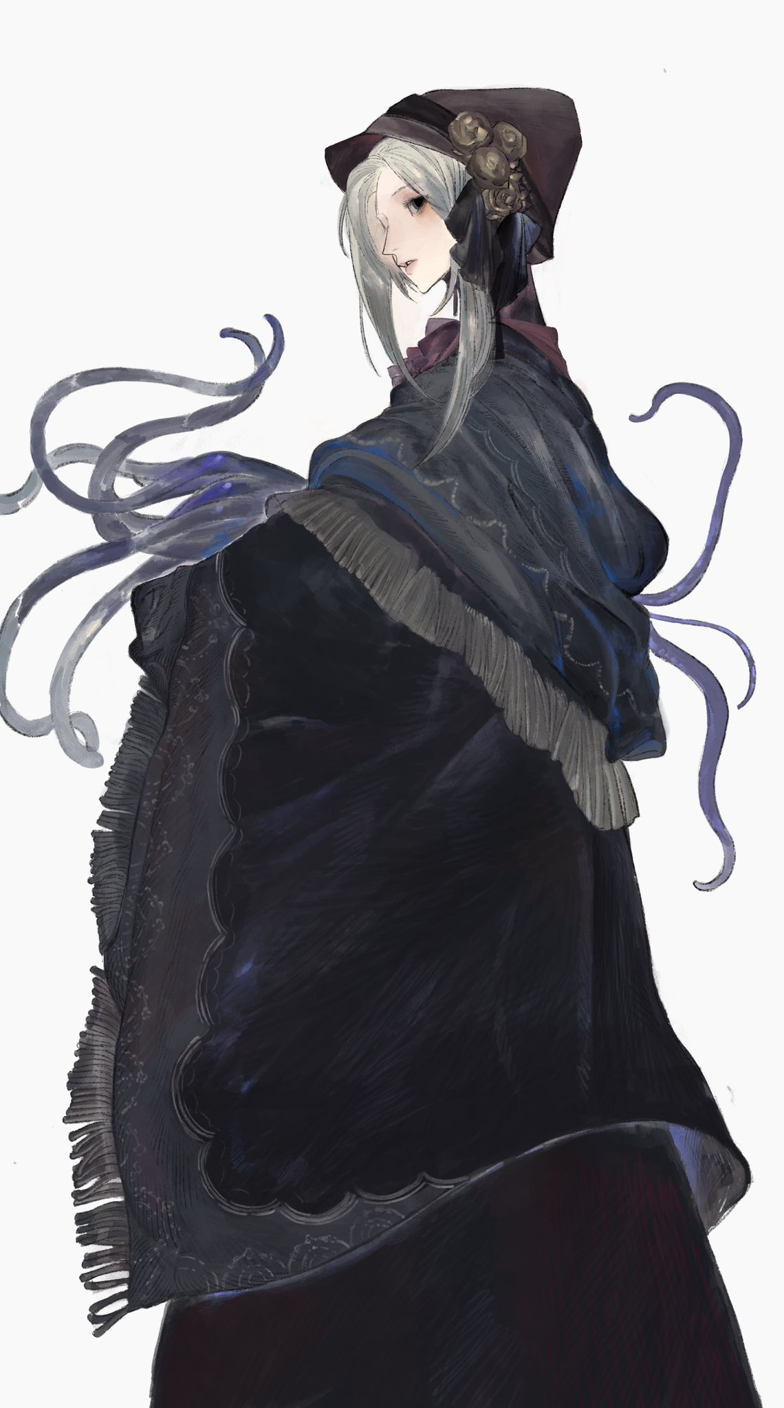 1boy 1girl ascot black_eyes bloodborne bonnet cloak flower from_below from_side grey_background hat hat_flower highres hunter_(great_one)_(bloodborne) opood parted_lips plain_doll robe sideways_glance simple_background standing tentacles