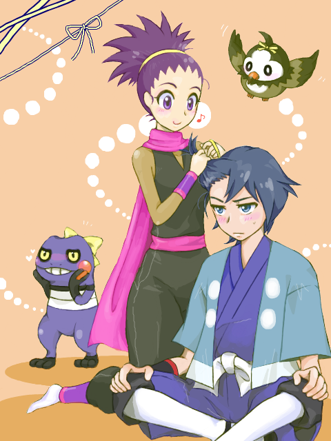 1boy 1girl adjusting_another's_hair blue_eyes blue_hair blush bow croagunk falkner_(pokemon) gen_4_pokemon janine_(pokemon) musical_note nintendo orange_background pokemon pokemon_(creature) pokemon_heartgold_and_soulsilver purple_eyes purple_hair purple_scarf scarf starly yuh_(250663)