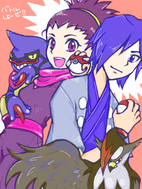 1boy 1girl blue_eyes blue_hair blue_kimono falkner_(pokemon) gen_4_pokemon hair_over_one_eye holding holding_poke_ball janine_(pokemon) japanese_clothes kimono looking_at_viewer nintendo open_mouth pink_background poke_ball poke_ball_(basic) pokemon pokemon_heartgold_and_soulsilver purple_eyes purple_hair purple_scarf scarf smile staraptor toxicroak wings yuh_(250663)