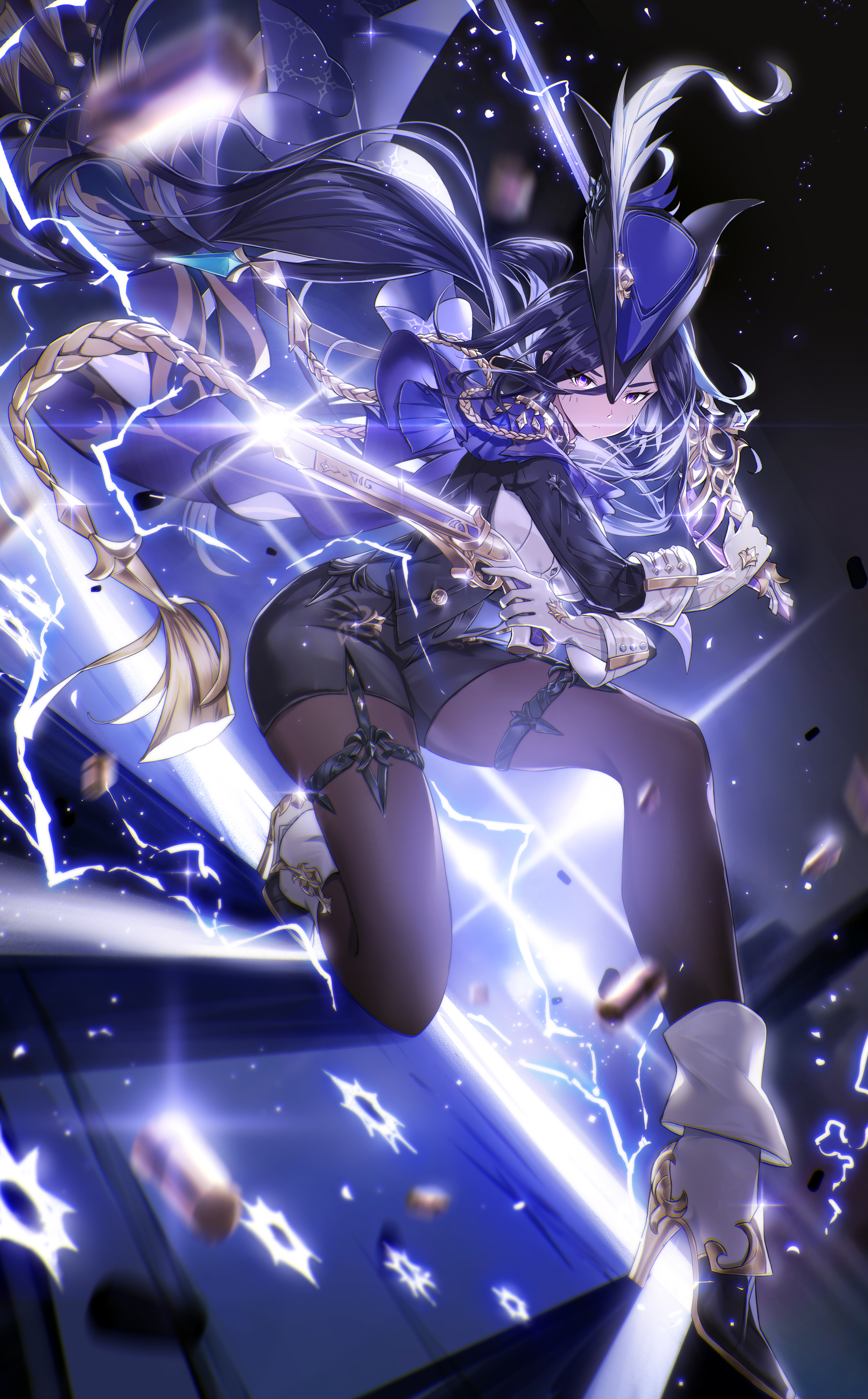 1girl absurdres antique_firearm ascot black_corset black_pantyhose blue_cape blue_hair blue_hat boots cape clenched_hands clorinde_(genshin_impact) commentary corset dark_blue_hair dual_wielding electricity epaulettes firearm floating_hair fold-over_boots fold-over_gloves framed_breasts full_body genshin_impact gloves gun handgun hat hat_feather high_heel_boots high_heels highres holding holding_gun holding_sword holding_weapon legs lengchan_(fu626878068) lightning long_hair long_sleeves looking_at_viewer low_ponytail multiple_weapons on_one_knee pantyhose parted_bangs ponytail purple_ascot purple_eyes serious shell_casing shirt sidelocks solo sword taut_clothes taut_shirt thigh_strap thighs tricorne very_long_hair vision_(genshin_impact) weapon white_boots white_gloves white_shirt