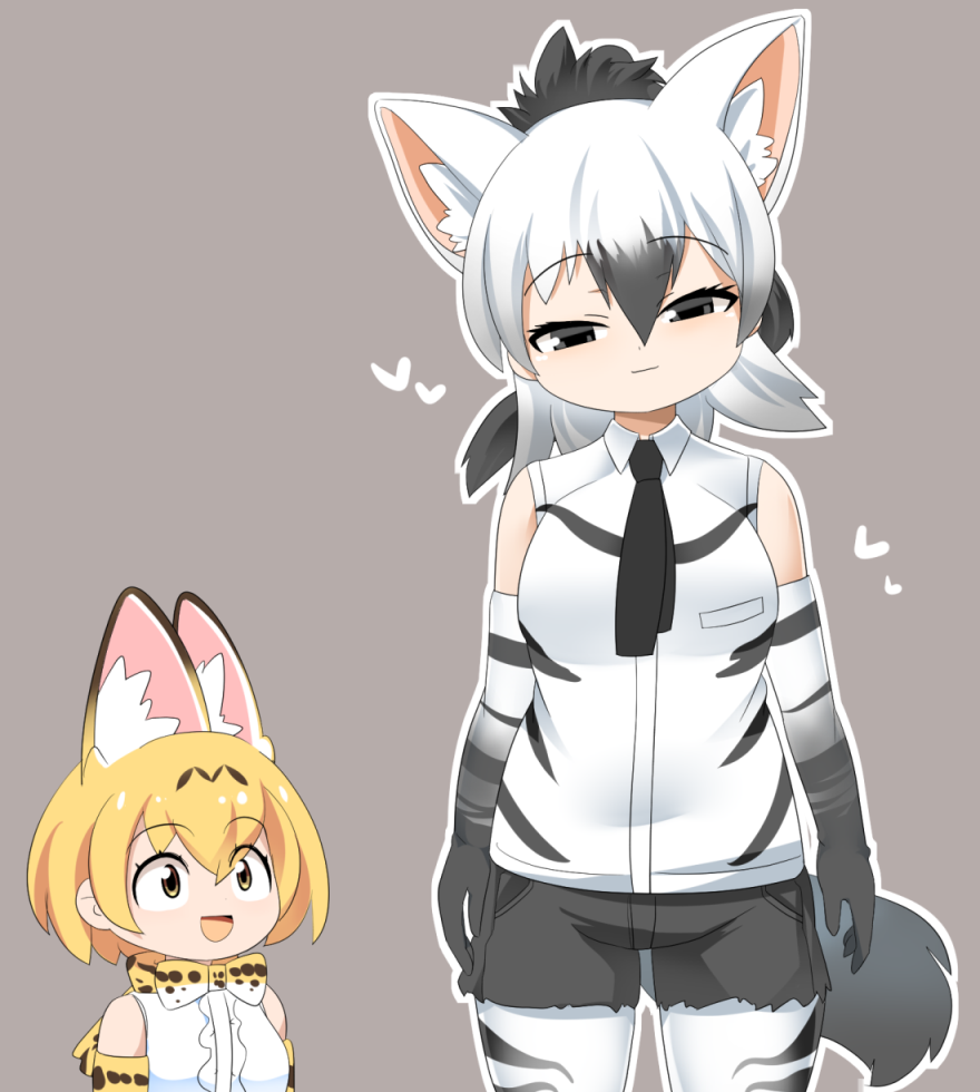 2girls aardwolf_(kemono_friends) animal_ears animal_print black_eyes black_gloves black_hair black_necktie black_shorts blush bow bowtie breasts cat_ears cat_girl closed_mouth collared_shirt commentary_request cowboy_shot elbow_gloves gloves grey_background hair_between_eyes heart kemono_friends leopard_print lets0020 long_bangs looking_at_another looking_at_viewer medium_breasts multicolored_hair multiple_girls necktie open_mouth outline print_bow print_bowtie serval_(kemono_friends) shirt shorts simple_background sleeveless sleeveless_shirt smile tail two-tone_hair white_gloves white_hair white_outline white_shirt wolf_ears wolf_girl wolf_tail yellow_eyes