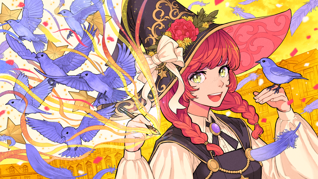 1girl bird bird_on_hand black_hat black_ribbon blue_bird blue_feathers bow braid brooch eyelashes falling_feathers feathers fingernails freckles green_eyes hair_bow hat holding holding_pen jewelry looking_at_viewer open_mouth original outdoors pen puffy_sleeves red_hair ribbon shirt twin_braids white_bow white_shirt witch_hat yukkedondon