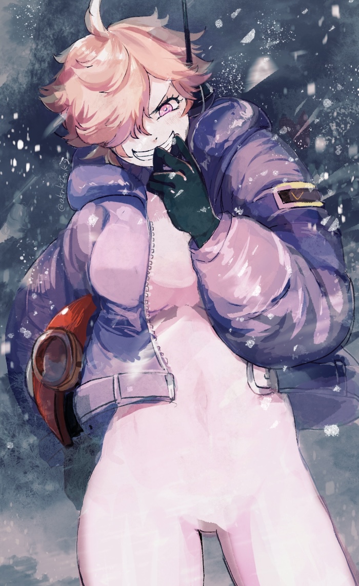 1girl akrk200kg black_gloves bodysuit clenched_teeth earpiece gloves hair_over_one_eye holding jacket leather leather_jacket one_eye_covered one_piece open_clothes open_jacket orange_hair outdoors pink_bodysuit pink_eyes purple_jacket short_hair smile snow snowing solo teeth vegapunk_lilith